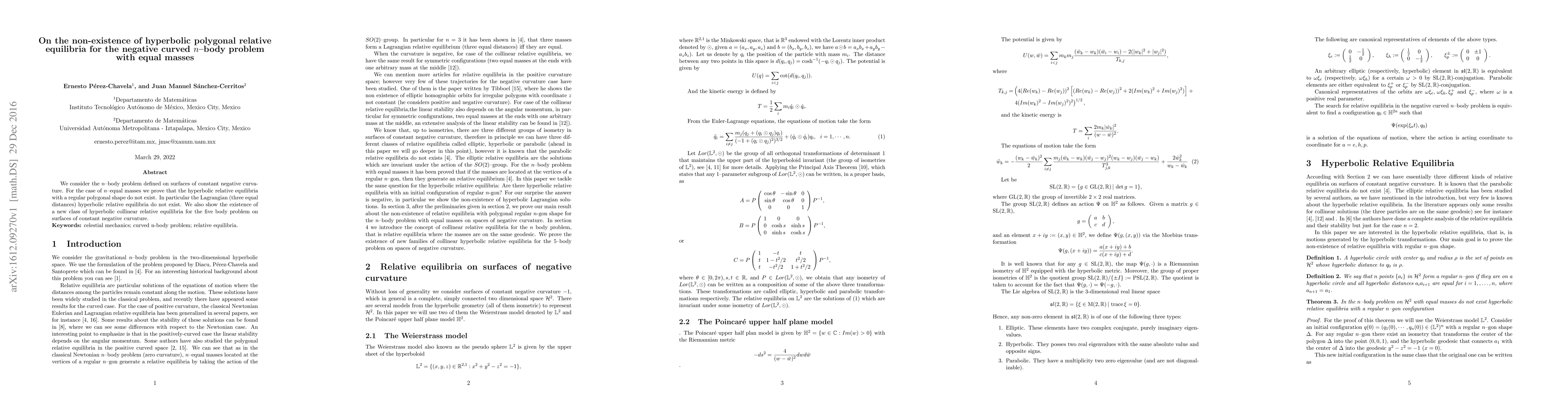 The paper proves the non-existence of hyperbolic polygonal relative equilibria with equal masses in the negative curved $n$--body problem, specifically ruling out regular polygonal shapes, and introduces a new class of hyperbolic collinear relative equilibria in the five-body case on such surfaces.