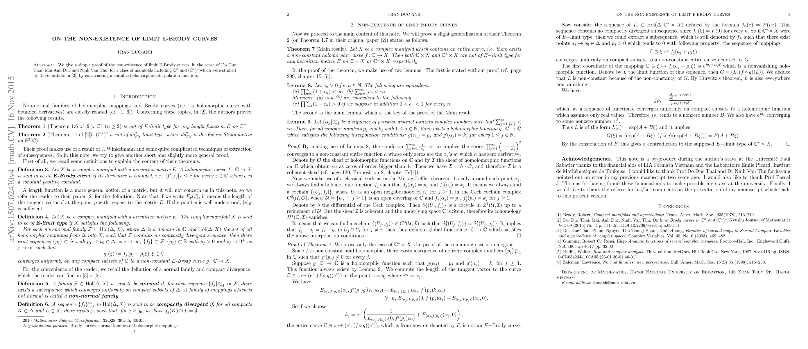 We give a simple proof of the non-existence of limit E-Brody curves, in the sense of Do Duc Thai, Mai Anh Duc and Ninh Van Thu, for a class of manifolds including $\mathbb{C}^n$ and $(\mathbb{C}^{\ast})^2$ which were studied by these authors in \cite{Do DT et al}, by constructing a suitable holomorphic interpolation function.