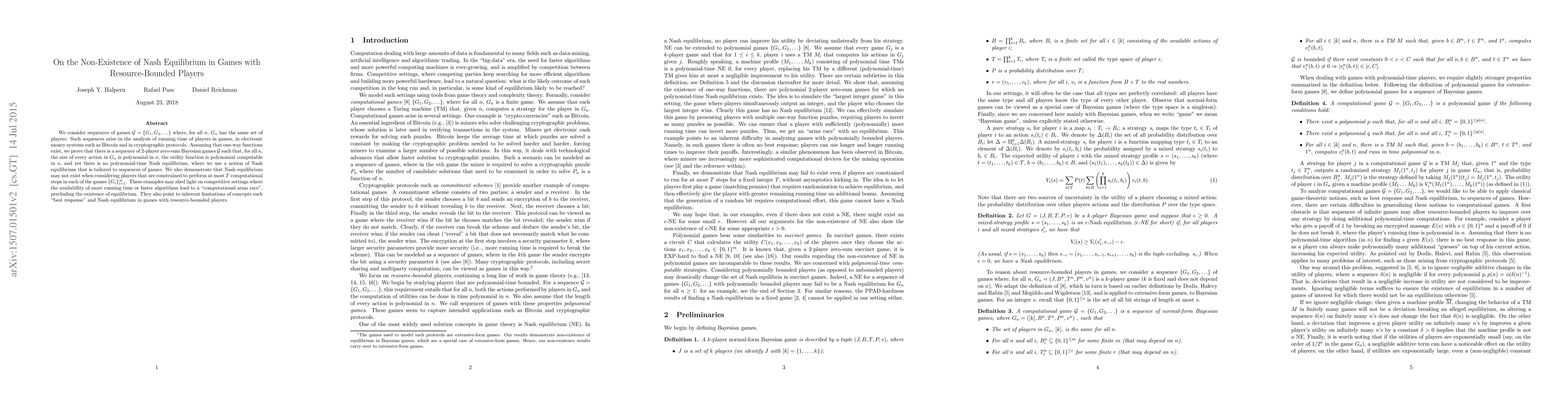 We consider sequences of games $\mathcal{G}=\{G_1,G_2,\ldots\}$ where, for all $n$, $G_n$ has the same set of players. Such sequences arise in the analysis of running time of players in games, in electronic money systems such as Bitcoin and in cryptographic protocols. Assuming that one-way functions exist, we prove that there is a sequence of 2-player zero-sum Bayesian games $\mathcal{G}$ such that, for all $n$, the size of every action in $G_n$ is polynomial in $n$, the utility function is polynomial computable in $n$, and yet there is no polynomial-time Nash equilibrium, where we use a notion of Nash equilibrium that is tailored to sequences of games. We also demonstrate that Nash equilibrium may not exist when considering players that are constrained to perform at most $T$ computational steps in each of the games $\{G_i\}_{i=1}^{\infty}$. These examples may shed light on competitive settings where the availability of more running time or faster algorithms lead to a "computational arms race", precluding the existence of equilibrium. They also point to inherent limitations of concepts such "best response" and Nash equilibrium in games with resource-bounded players.