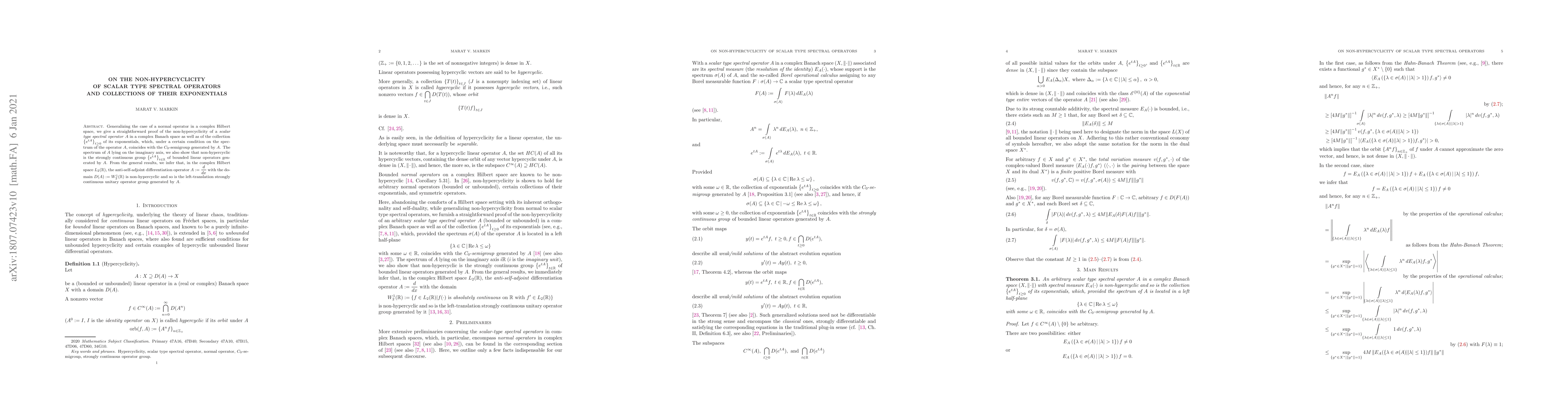 Generalizing the case of a normal operator in a complex Hilbert space, we give a straightforward proof of the non-hypercyclicity of a (bounded or unbounded) scalar type spectral operator $A$ in a complex Banach space as well as of the collection $\left\{e^{tA}\right\}_{t\ge 0}$ of the exponentials of such an operator, which, under a certain condition on the spectrum of the operator $A$, coincides with the $C_0$-semigroup generated by $A$. The spectrum of $A$ lying on the imaginary axis, we also show that non-hypercyclic is the strongly continuous group $\left\{e^{tA}\right\}_{t\in {\mathbb R}}$ of bounded linear operators generated by $A$. From the general results, we infer that, in the complex Hilbert space $L_2({\mathbb R})$, the anti-self-adjoint differentiation operator $A:=\dfrac{d}{dx}$ with the domain $D(A):=W_2^1({\mathbb R})$ is non-hypercyclic and so is the left-translation strongly continuous unitary operator group generated by $A$.