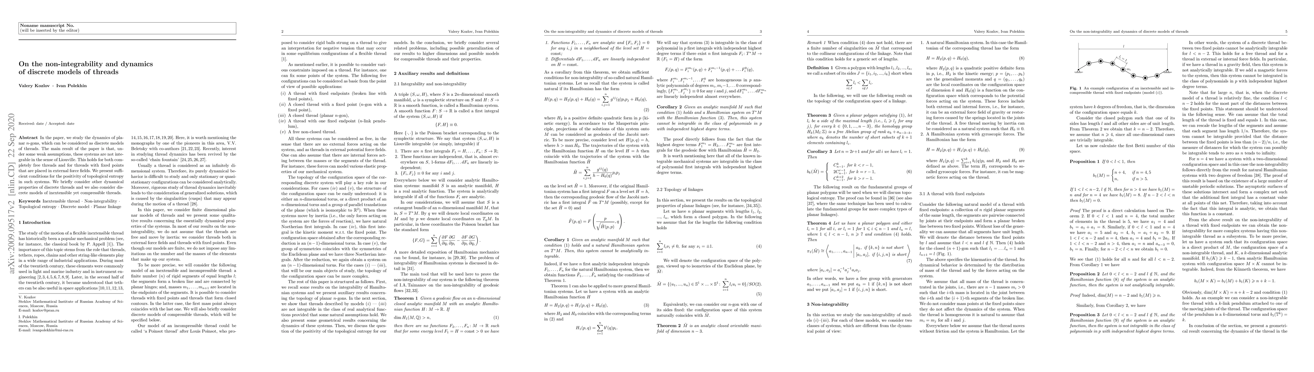 In the paper, we study the dynamics of planar $n$-gons, which can be considered as discrete models of threads. The main result of the paper is that, under some weak assumptions, these systems are not integrable in the sense of Liouville. This holds for both completely free threads and for threads with fixed points that are placed in external force fields. We present sufficient conditions for the positivity of topological entropy in such systems. We briefly consider other dynamical properties of discrete threads and we also consider discrete models of inextensible yet compressible threads.