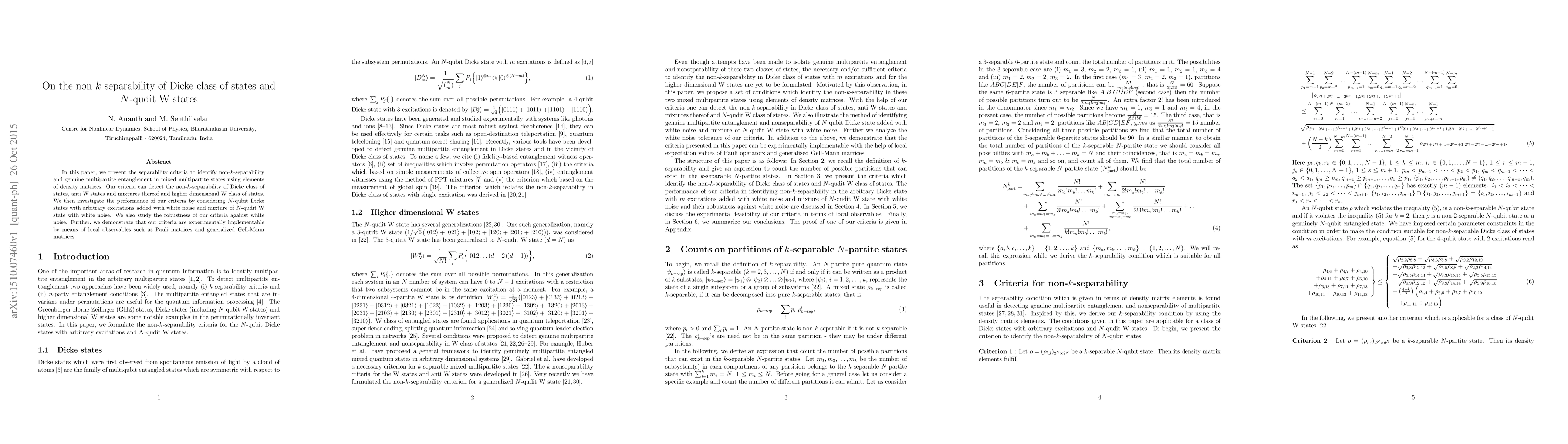 This paper develops criteria for identifying non-$k$-separability and genuine multipartite entanglement in mixed quantum states, applying it to Dicke and W class states, and demonstrates robustness against noise using local observables. The criteria's practical implementation is shown through examples involving $N$-qubit Dicke and $N$-qudit W states.