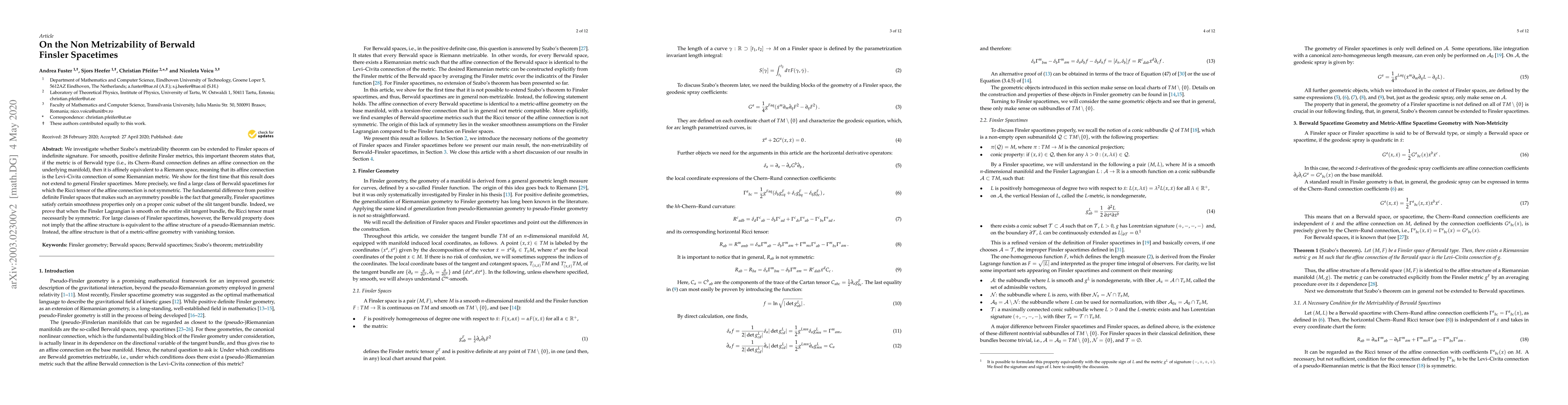 We investigate whether Szabo's metrizability theorem can be extended to Finsler spaces of indefinite signature. For smooth, positive definite Finsler metrics, this important theorem states that, if the metric is of Berwald type (i.e., its Chern-Rund connection defines an affine connection on the underlying manifold), then it is affinely equivalent to a Riemann space, meaning that its affine connection is the Levi-Civita connection of some Riemannian metric. We show for the first time that this result does not extend to Finsler spacetimes. More precisely, we find a large class of Berwald spacetimes for which the Ricci tensor of the affine connection is not symmetric. The fundamental difference from positive definite Finsler spaces that makes such an asymmetry possible, is the fact that generally, Finsler spacetimes satisfy certain smoothness properties only on a proper conic subset of the slit tangent bundle. Indeed, we prove that when the Finsler Lagrangian is smooth on the entire slit tangent bundle, the Ricci tensor must necessarily be symmetric. For large classes of Finsler spacetimes, however, the Berwald property does not imply that the affine structure is equivalent to the affine structure of a pseudo-Riemannian metric. Instead, the affine structure is that of metric-affine geometry with vanishing torsion.