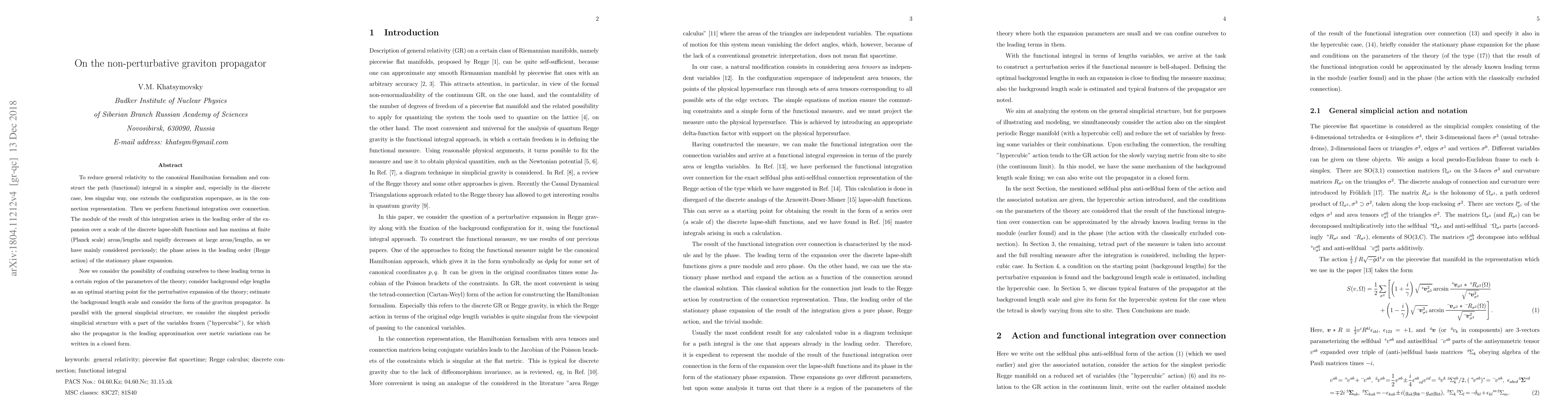 To reduce general relativity to the canonical Hamiltonian formalism and construct the path (functional) integral in a simpler and, especially in the discrete case, less singular way, one extends the configuration superspace, as in the connection representation. Then we perform functional integration over connection. The module of the result of this integration arises in the leading order of the expansion over a scale of the discrete lapse-shift functions and has maxima at finite (Planck scale) areas/lengths and rapidly decreases at large areas/lengths, as we have mainly considered previously; the phase arises in the leading order (Regge action) of the stationary phase expansion. Now we consider the possibility of confining ourselves to these leading terms in a certain region of the parameters of the theory; consider background edge lengths as an optimal starting point for the perturbative expansion of the theory; estimate the background length scale and consider the form of the graviton propagator. In parallel with the general simplicial structure, we consider the simplest periodic simplicial structure with a part of the variables frozen ("hypercubic"), for which also the propagator in the leading approximation over metric variations can be written in a closed form.