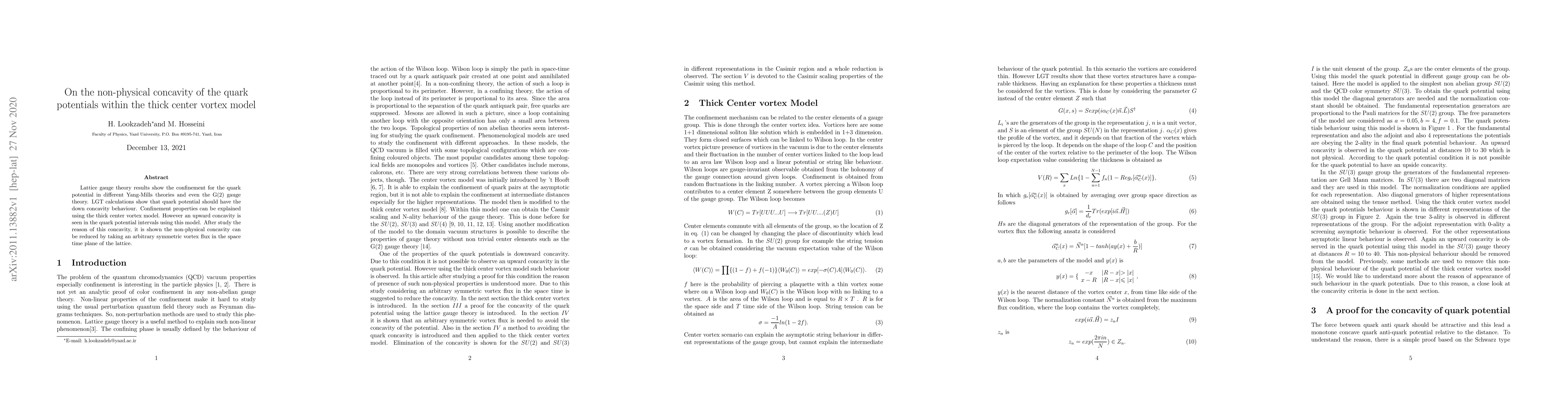 Summary: Lattice gauge theory reveals that quark potentials exhibit down concavity in confinement, but the thick center vortex model shows upward concavity. The non-physical concavity can be mitigated by considering an arbitrary symmetric vortex flux in the lattice's spacetime plane.