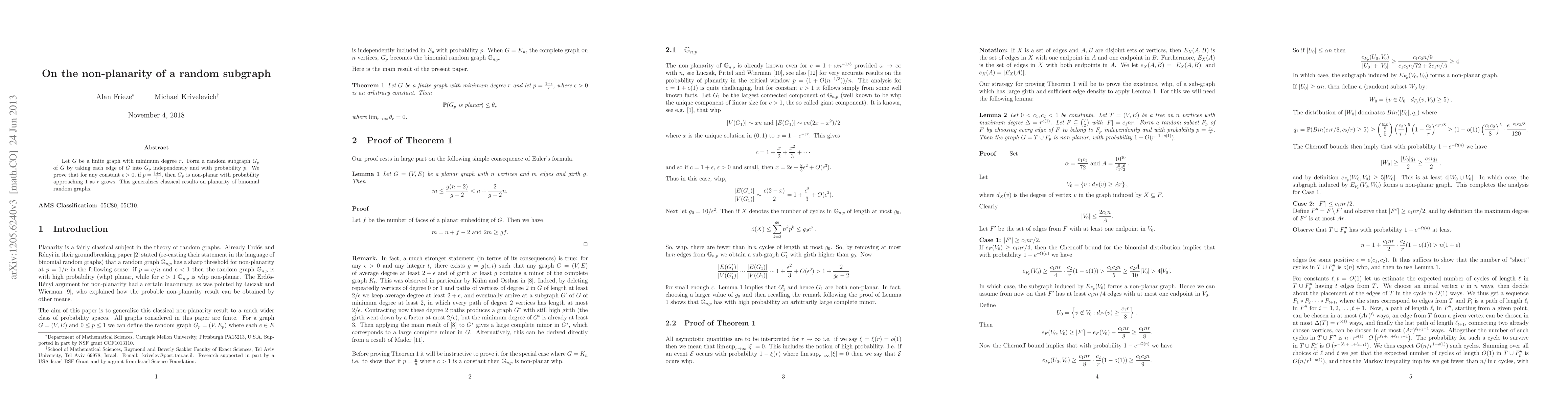 Let $G$ be a finite graph with minimum degree $r$. Form a random subgraph $G_p$ of $G$ by taking each edge of $G$ into $G_p$ independently and with probability $p$. We prove that for any constant $\epsilon>0$, if $p=\frac{1+\epsilon}{r}$, then $G_p$ is non-planar with probability approaching 1 as $r$ grows. This generalizes classical results on planarity of binomial random graphs.