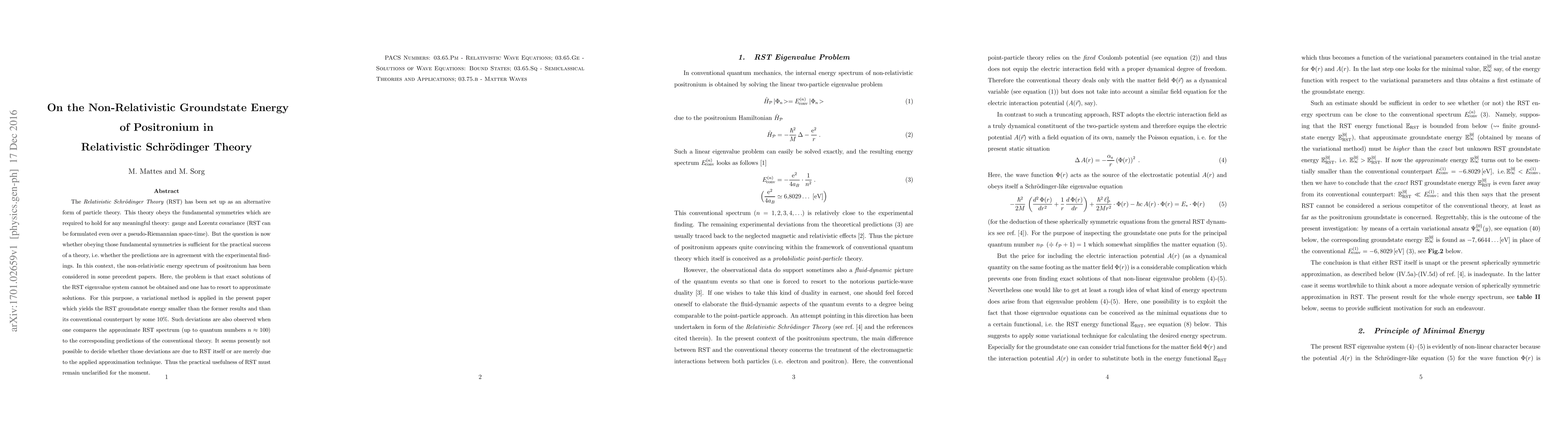 This paper explores the non-relativistic groundstate energy of positronium within Relativistic Schrödinger Theory (RST), finding a lower energy than conventional theory by about 10% using a variational method. The practical success of RST remains uncertain due to deviations in the spectrum and the reliance on approximations.