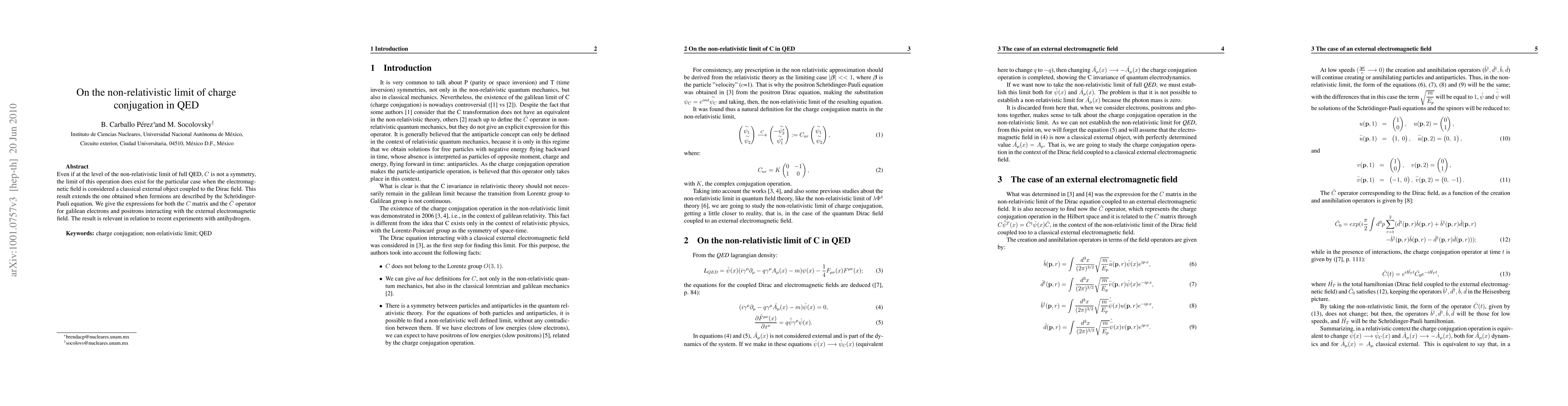 This paper investigates the non-relativistic limit of charge conjugation in quantum electrodynamics (QED), showing that while C symmetry doesn't hold in full QED, it exists in the classical electromagnetic field limit for Dirac fermions. The study provides expressions for the C matrix and the $\hat{C}$ operator for galilean electrons and positrons, relevant for recent antihydrogen experiments.