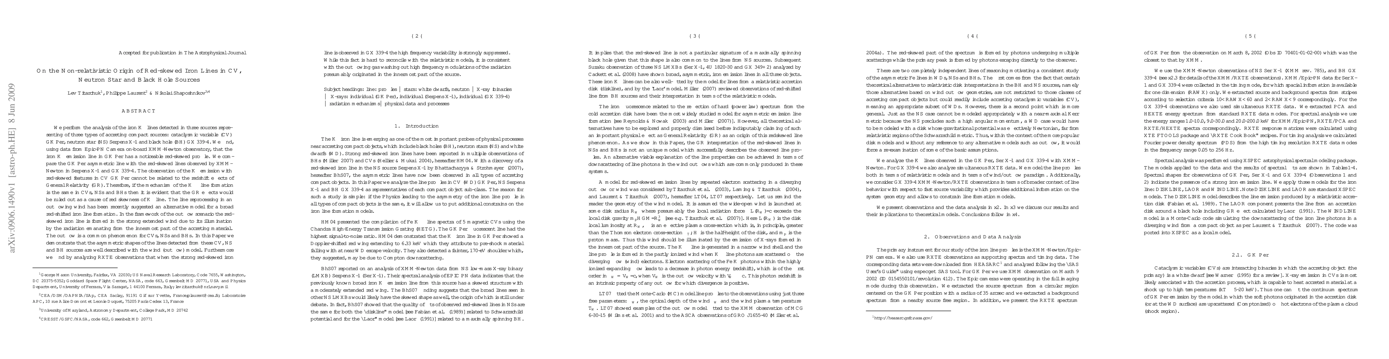 We perform the analysis of the iron K_alpha lines detected in three sources representing of three types of accreting compact sources: cataclysmic variable (CV) GK Per, neutron star (NS) Serpens X-1 and black hole (BH) GX 339-4. We find, using data from Epic-PN Camera on-board XMM-Newton observatory,that the iron K_alpha emission line in GK Per has a noticeable red-skewed profile. We compare the GK Per asymmetric line with the red-skewed lines observed by XMM-Newton in Serpens X-1 and GX 339-4. The observation of the K_alpha emission with red-skewed features in CV GK Per cannot be related to the redshift effects of General Relativity (GR). Therefore, if the mechanism of the K_alpha-line formation is the same in CVs, NSs and BHs then it is evident that the GR effects would be ruled out as a cause of red skewness of K_alpha line. The line reprocessing in an outflowing wind has been recently suggested an alternative model for a broad red-shifted iron line formation. In the framework of the outflow scenario the red-skewed iron line is formed in the strong extended wind due to its illumination by the radiation emanating from the innermost part of the accreting material. In this Paper we demonstrate that the asymmetric shapes of the lines detected from these CV, NS and BH sources are well described with the wind (outflow) model. While this fact is hard to reconcile with the relativistic models, it is consistent with the outflowing gas washing out high frequency modulations of the radiation presumably originated in the innermost part of the source.