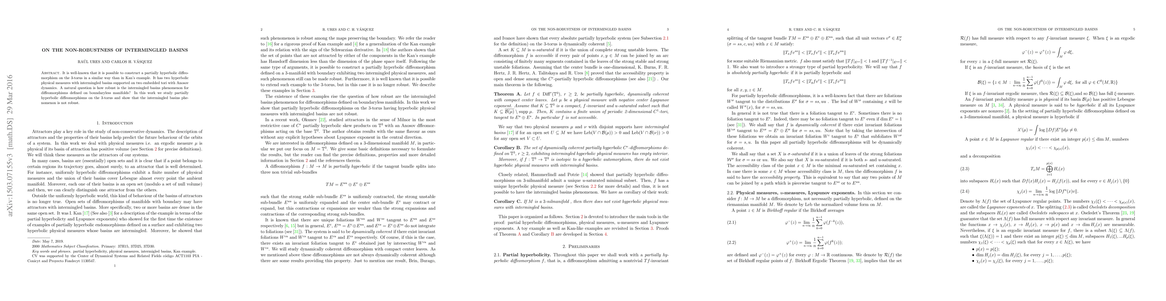 It is well-known that it is possible to construct a partially hyperbolic diffeomorphism on the 3-torus in a similar way than in Kan's example. It has two hyperbolic physical measures with intermingled basins supported on two embedded tori with Anosov dynamics. A natural question is how robust is the intermingled basins phenomenon for diffeomorphisms defined on boundaryless manifolds? In this work we will show that on the 3-torus the only partially hyperbolic examples having hyperbolic physical measures with intermingled basins are not robust.