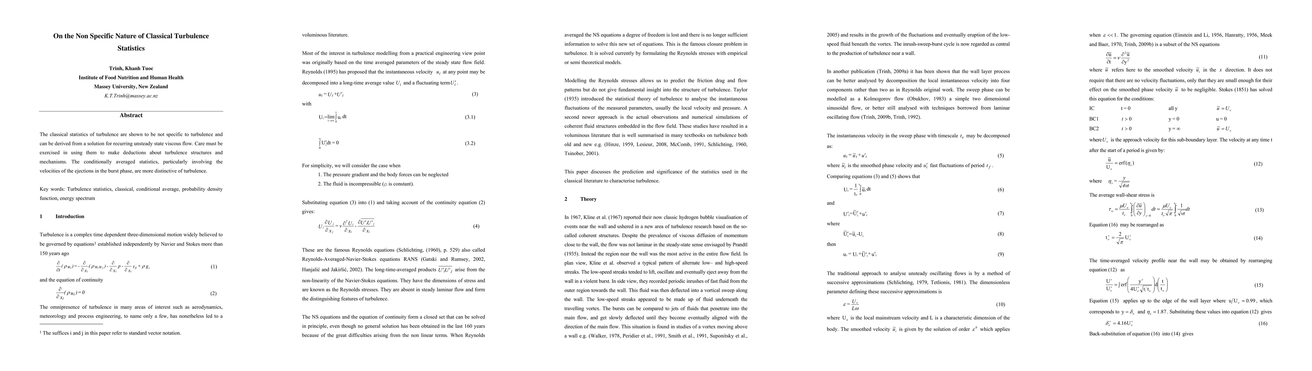 The classical statistics of turbulence are shown to be not specific to turbulence and can be derived from a solution for recurring unsteady state viscous flow. Care must be exercised in using them to make deductions about turbulence structures and mechanisms. The conditionally averaged statistics, particularly involving the velocities of the ejections in the burst phase, are more distinctive of turbulence. Key words: Turbulence statistics, classical, conditional average, probability density function, energy spectrum