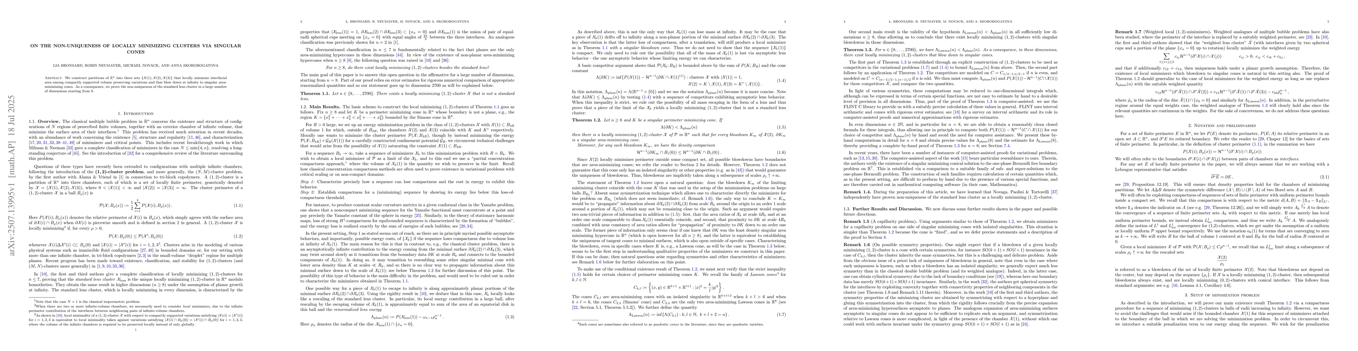 We construct partitions of $\mathbb{R}^n$ into three sets $\{\mathscr{X}(1),\mathscr{X}(2),\mathscr{X}(3)\}$ that locally minimize interfacial area among compactly supported volume preserving variations and that blow down at infinity to singular area-minimizing cones. As a consequence, we prove the non-uniqueness of the standard lens cluster in a large number of dimensions starting from $8$.