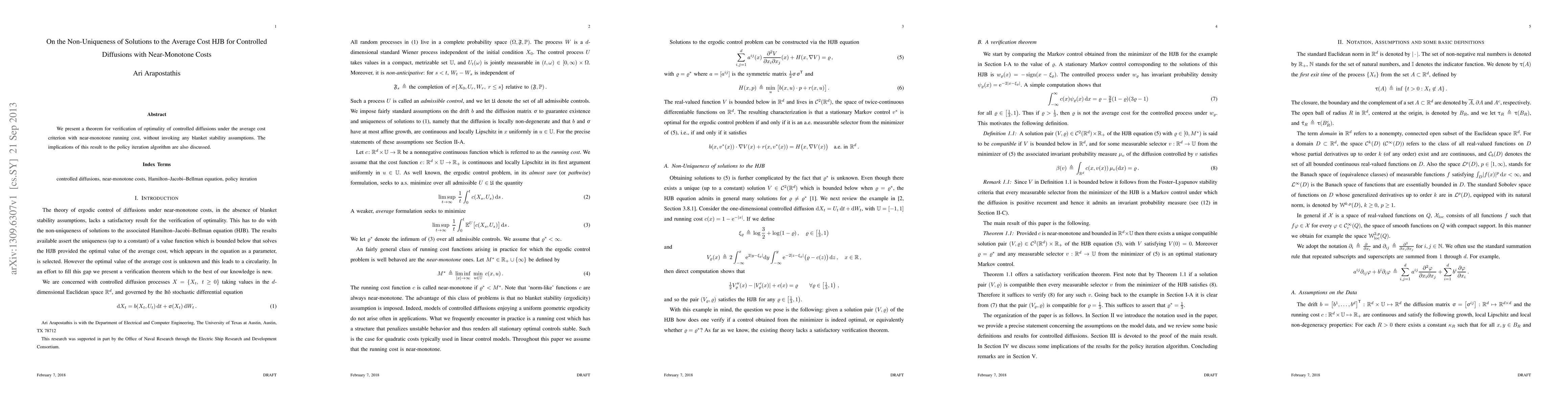 This paper proves a theorem verifying the optimality of controlled diffusions under an average cost criterion with near-monotone costs, without relying on general stability assumptions. It also explores the implications of this result for the policy iteration algorithm.