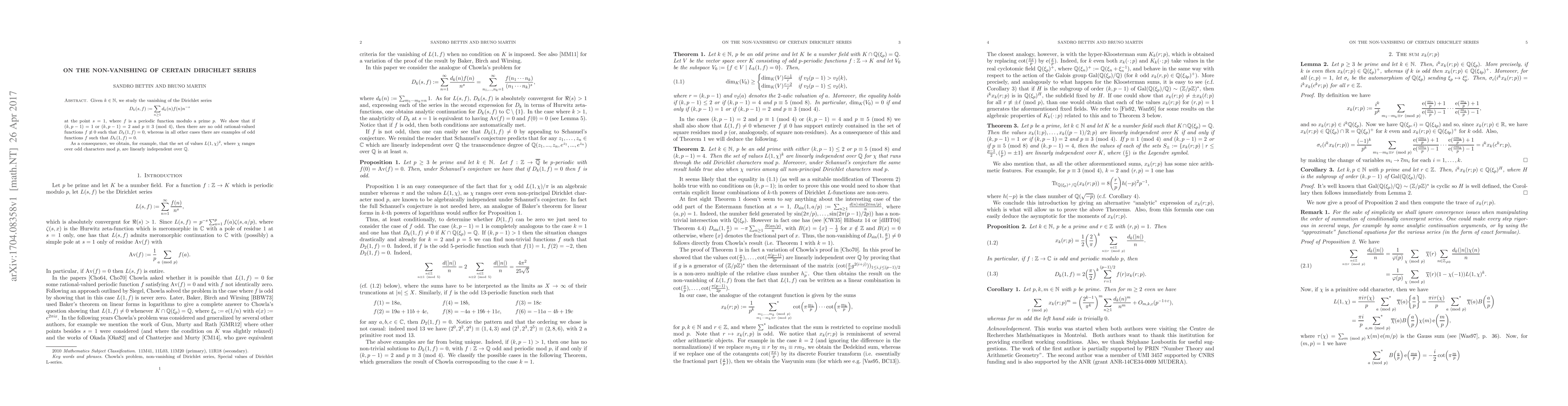 Given $k\in\mathbb N$, we study the vanishing of the Dirichlet series $$D_k(s,f):=\sum_{n\geq1} d_k(n)f(n)n^{-s}$$ at the point $s=1$, where $f$ is a periodic function modulo a prime $p$. We show that if $(k,p-1)=1$ or $(k,p-1)=2$ and $p\equiv 3\mod 4$, then there are no odd rational-valued functions $f\not\equiv 0$ such that $D_k(1,f)=0$, whereas in all other cases there are examples of odd functions $f$ such that $D_k(1,f)=0$. As a consequence, we obtain, for example, that the set of values $L(1,\chi)^2$, where $\chi$ ranges over odd characters mod $p$, are linearly independent over $\mathbb Q$.