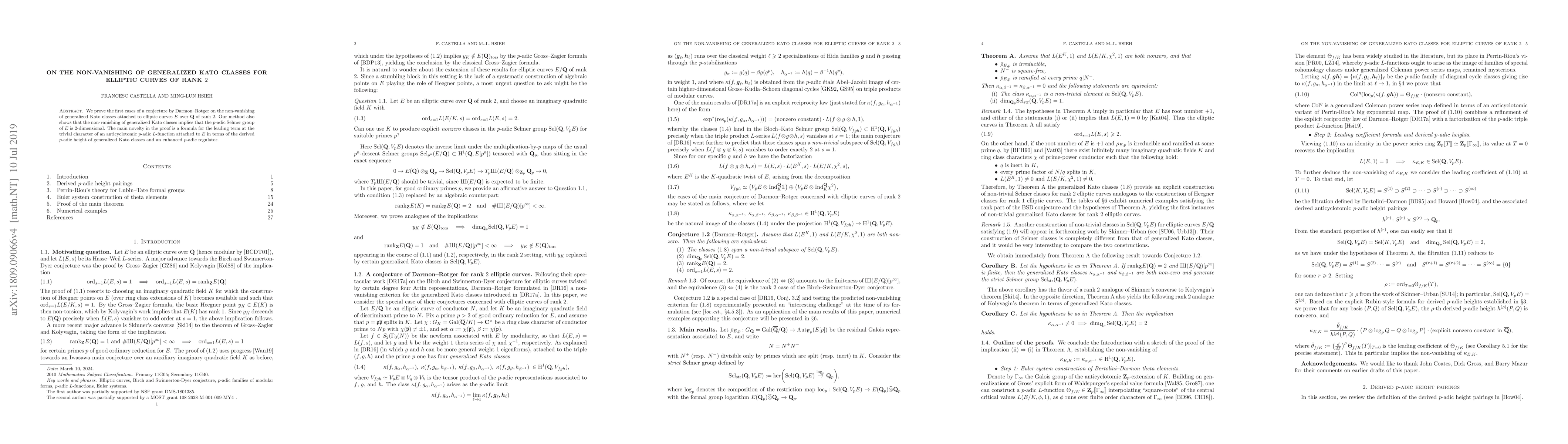 We prove the first cases of a conjecture by Darmon--Rotger on the non-vanishing of generalized Kato classes attached to elliptic curves $E$ over $\mathbf{Q}$ of rank $2$. Our method also shows that the non-vanishing of generalized Kato classes implies that the $p$-adic Selmer group of $E$ is $2$-dimensional. The main novelty in the proof is a formula for the leading term at the trivial character of an anticyclotomic $p$-adic $L$-function attached to $E$ in terms of the derived $p$-adic height of generalized Kato classes and an enhanced $p$-adic regulator.