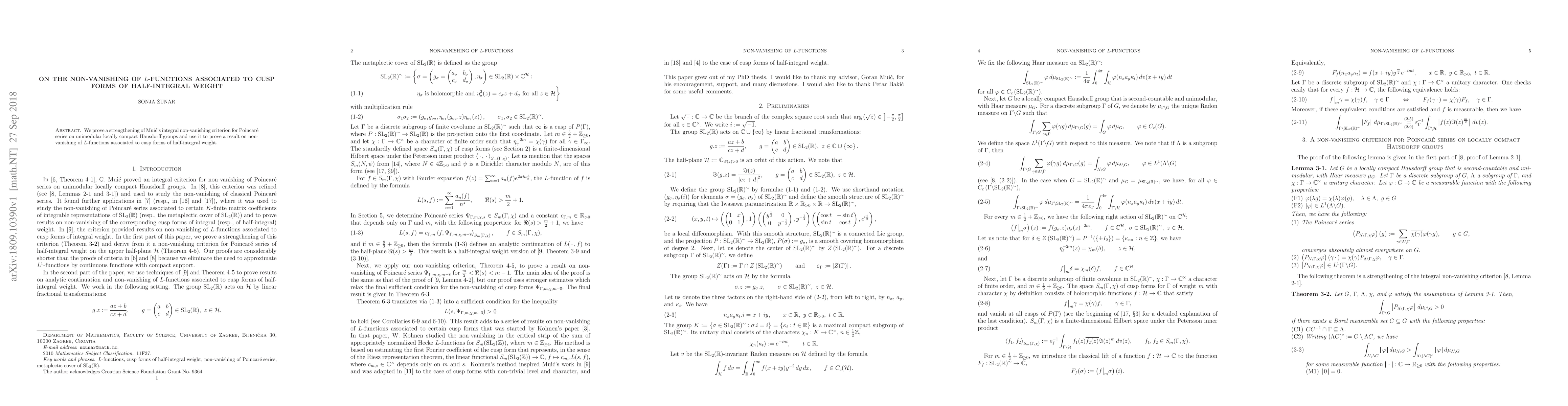 We prove a strengthening of Mui\'c's integral non-vanishing criterion for Poincar\'e series on unimodular locally compact Hausdorff groups and use it to prove a result on non-vanishing of L-functions associated to cusp forms of half-integral weight.