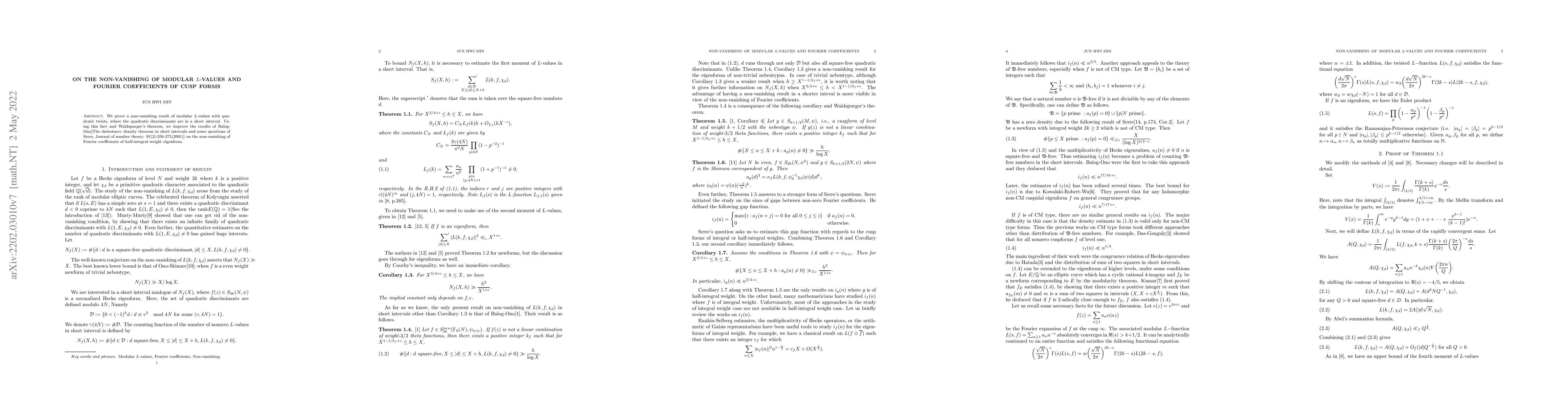 Summary: This paper establishes a non-vanishing result for modular L-values with quadratic twists in a specified interval, leveraging this to enhance previous findings on the non-vanishing of Fourier coefficients for half-integral weight eigenforms, building on Waldspurger's theorem.