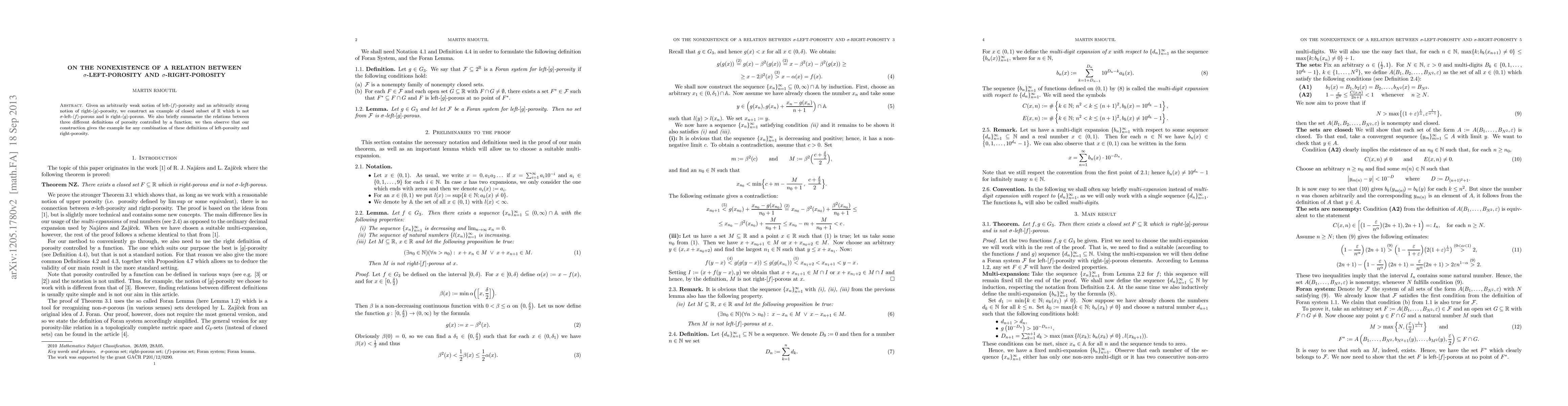 This paper demonstrates that there is no inherent relation between σ-left-porosity and σ-right-porosity by constructing a closed subset of the real line that is not σ-left-porous but is σ-right-porous, highlighting the independence of these two porosity concepts.