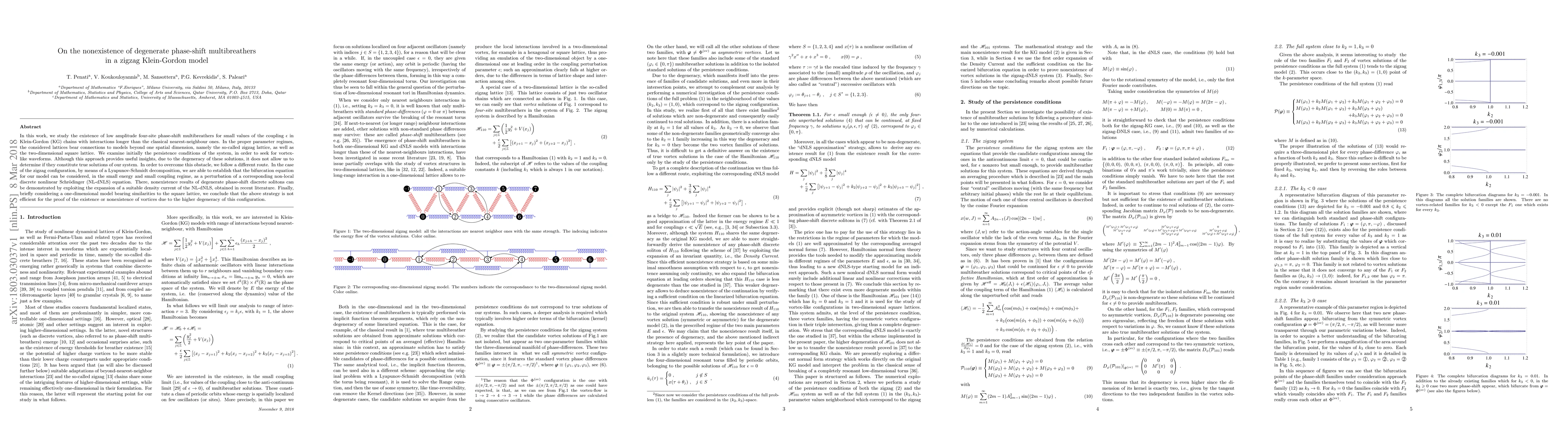 Researchers study Klein-Gordon chains with interactions longer than nearest neighbors, finding that degenerate phase-shift multibreathers do not exist in a specific zigzag configuration, using Lyapunov-Schmidt decomposition to analyze the system.