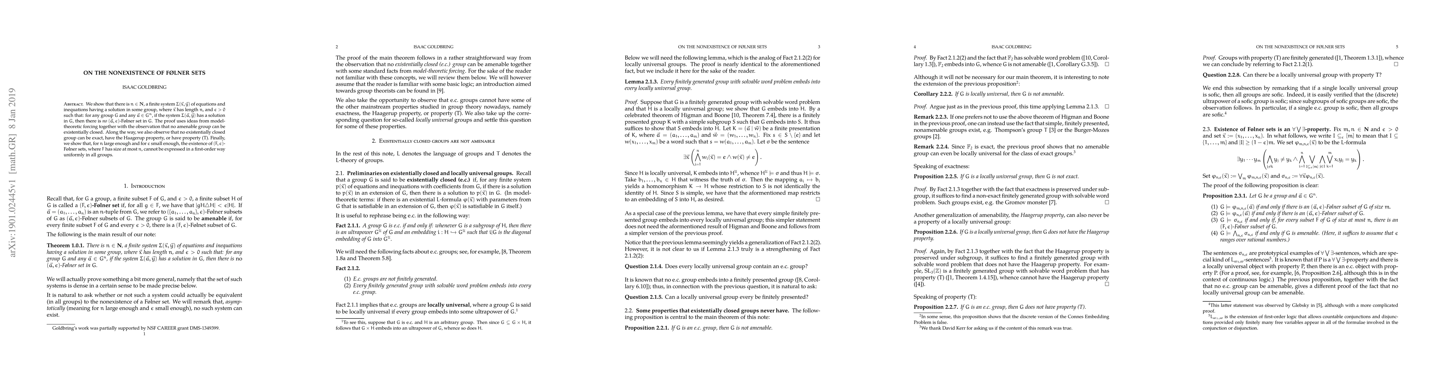 This paper demonstrates the nonexistence of certain F{\o}lner sets in groups by showing that specific systems of equations and inequations preclude the existence of such sets. The proof employs model-theoretic forcing and reveals additional properties of existentially closed groups, including their lack of exactness, Haagerup property, and property (T).