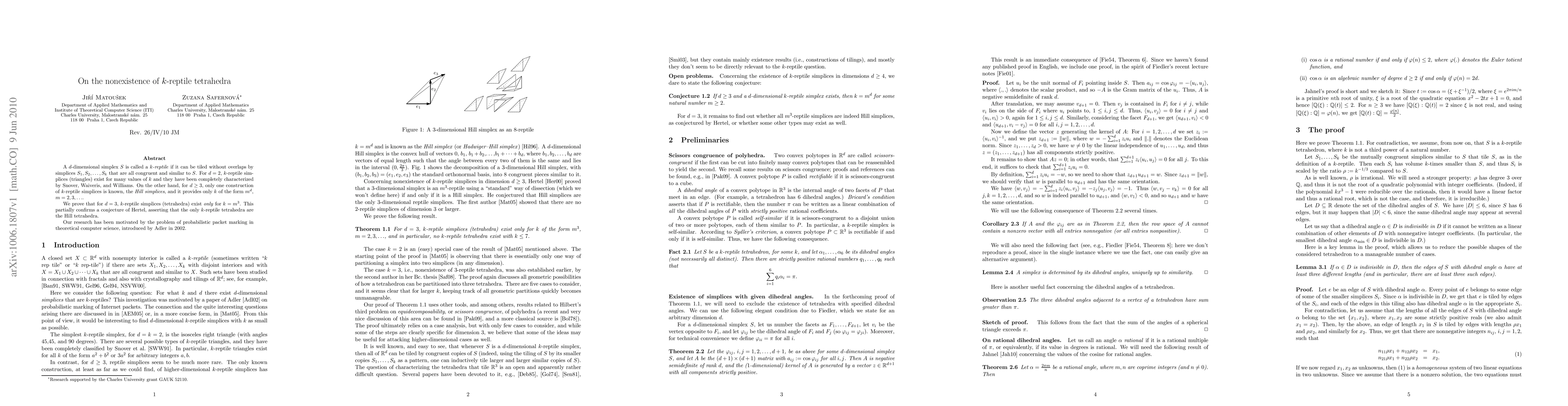 This paper proves that k-reptile tetrahedra exist only for k of the form m^3, confirming a conjecture that only Hill tetrahedra are k-reptiles. This research is motivated by the problem of probabilistic packet marking in theoretical computer science.