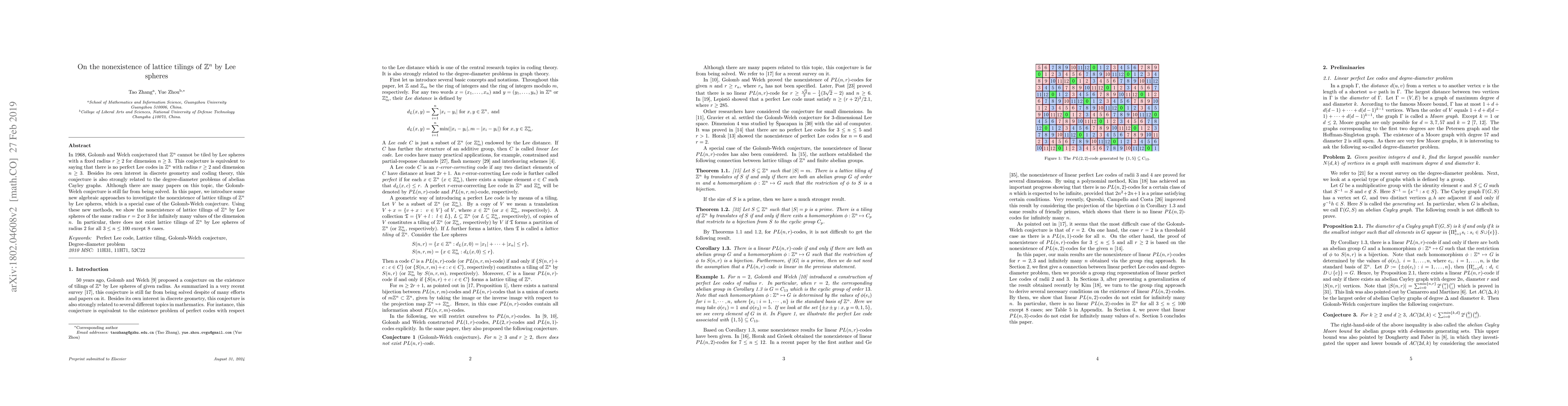 In 1968, Golomb and Welch conjectured that there does not exist perfect Lee code in $\mathbb{Z}^{n}$ with radius $r\ge2$ and dimension $n\ge3$. Besides its own interest in coding theory and discrete geometry, this conjecture is also strongly related to the degree-diameter problems of abelian Cayley graphs. Although there are many papers on this topic, the Golomb-Welch conjecture is far from being solved. In this paper, we prove the nonexistence of linear perfect Lee codes by introducing some new algebraic methods. Using these new methods, we show the nonexistence of linear perfect Lee codes of radii $r=2,3$ in $\mathbb{Z}^n$ for infinitely many values of the dimension $n$. In particular, there does not exist linear perfect Lee codes of radius $2$ in $\mathbb{Z}^n$ for all $3\le n\le 100$ except 8 cases.