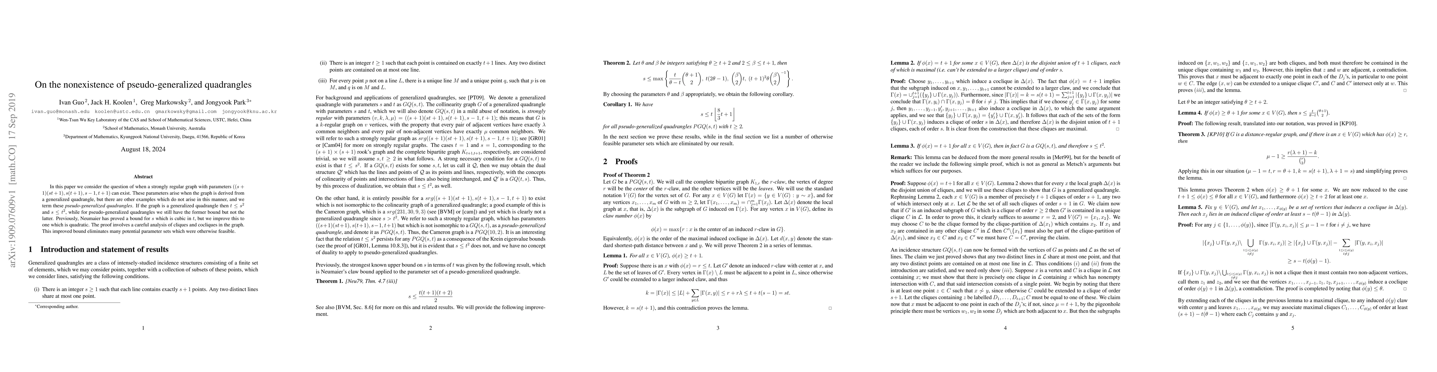 In this paper we consider the question of when a strongly regular graph with parameters $((s+1)(st+1),s(t+1),s-1,t+1)$ can exist. These parameters arise when the graph is derived from a generalized quadrangle, but there are other examples which do not arise in this manner, and we term these {\it pseudo-generalized quadrangles}. If the graph is a generalized quadrangle then $t \leq s^2$ and $s \leq t^2$, while for pseudo-generalized quadrangles we still have the former bound but not the latter. Previously, Neumaier has proved a bound for $s$ which is cubic in $t$, but we improve this to one which is quadratic. The proof involves a careful analysis of cliques and cocliques in the graph. This improved bound eliminates many potential parameter sets which were otherwise feasible.