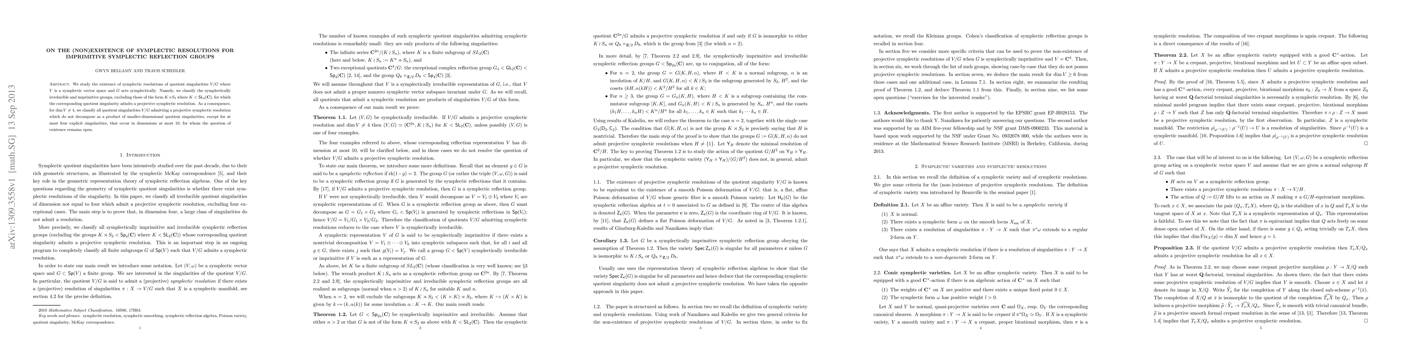 We study the existence of symplectic resolutions of quotient singularities V/G where V is a symplectic vector space and G acts symplectically. Namely, we classify the symplectically irreducible and imprimitive groups, excluding those of the form $K \rtimes S_2$ where $K < \SL_2(\C)$, for which the corresponding quotient singularity admits a projective symplectic resolution. As a consequence, for $\dim V \neq 4$, we classify all quotient singularities $V/G$ admitting a projective symplectic resolution which do not decompose as a product of smaller-dimensional quotient singularities, except for at most four explicit singularities, that occur in dimensions at most 10, for whom the question of existence remains open.
