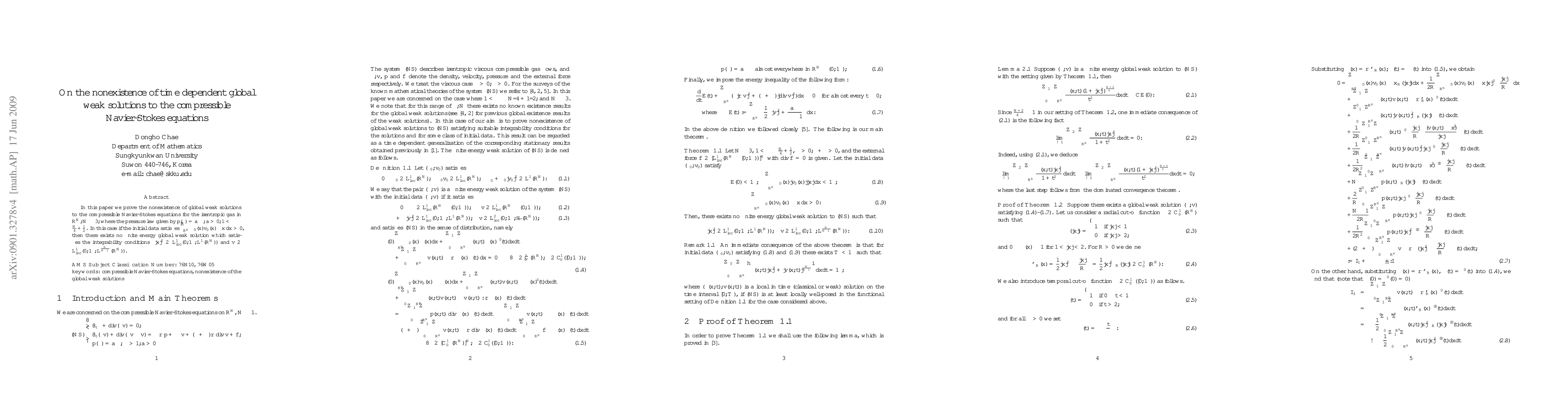 In this paper we prove the nonexistence of global weak solutions to the compressible Navier-Stokes equations for the isentropic gas in $\Bbb R^N, N\geq 3,$ where the pressure law given by $p(\rho)=a\rho^{\gamma}, $ $a>0, 1<\gamma \leq \frac{N}{4}+\frac12$. In this case if the initial data satisfies $\int_{\Bbb R^N} \rho_0 (x)v_0 (x)\cdot x dx >0$, then there exists no finite energy global weak solution which satisfies the integrability conditions $ \rho |x|^2 \in L^1_{\mathrm{loc}} (0, \infty; L^1 (\Bbb R^N))$ and $ v\in L^1_{\mathrm{loc}} (0, \infty; L^{\frac{N}{N-1}} (\Bbb R^N))$.