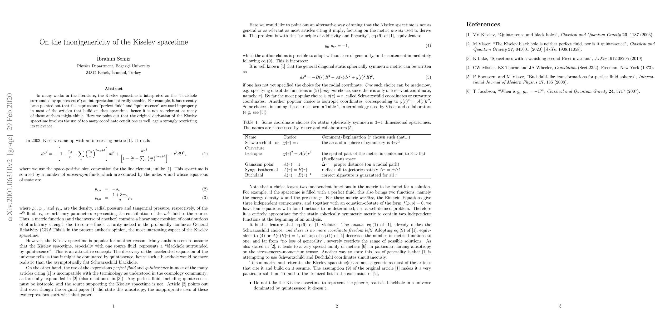 In many works in the literature, the Kiselev spacetime is interpreted as the "blackhole surrounded by quintessence"; an interpretation not really tenable. For example, it has recently been pointed out that the expressions "perfect fluid" and "quintessence" are used improperly in most of the articles that build on that spacetime; hence it is not as relevant as many of those authors might think. Here we point out that the original derivation of the Kiselev spacetime involves the use of too many coordinate conditions as well, again strongly restricting its relevance.