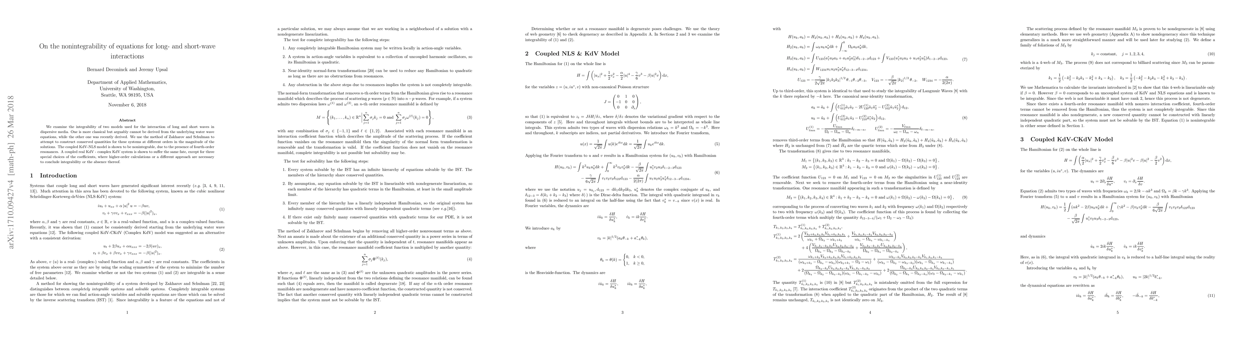 We examine the integrability of two models used for the interaction of long and short waves in dispersive media. One is more classical but arguably cannot be derived from the underlying water wave equations, while the other one was recently derived. We use the method of Zakharov and Schulman to attempt to construct conserved quantities for these systems at different orders in the magnitude of the solutions. The coupled KdV-NLS model is shown to be nonintegrable, due to the presence of fourth-order resonances. A coupled real KdV - complex KdV system is shown to suffer the same fate, except for three special choices of the coefficients, where higher-order calculations or a different approach are necessary to conclude integrability or the absence thereof.