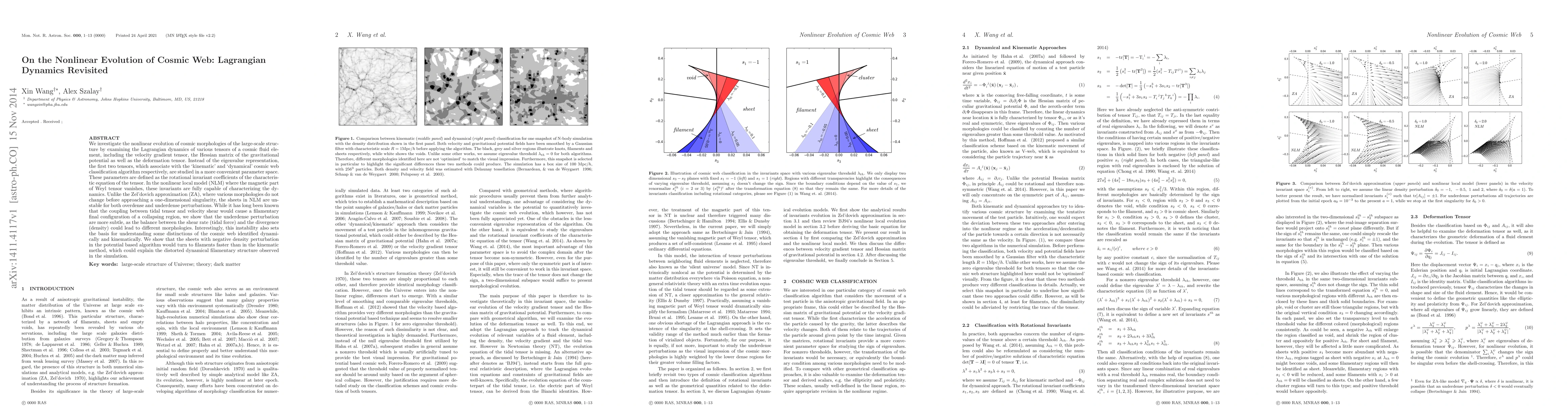 We investigate the nonlinear evolution of cosmic morphologies of the large-scale structure by examining the Lagrangian dynamics of various tensors of a cosmic fluid element, including the velocity gradient tensor, the Hessian matrix of the gravitational potential as well as the deformation tensor. Instead of the eigenvalue representation, the first two tensors, which associate with the "kinematic" and "dynamical" cosmic web classification algorithm respectively, are studied in a more convenient parameter space. These parameters are defined as the rotational invariant coefficients of the characteristic equation of the tensor. In the nonlinear local model (NLM) where the magnetic part of Weyl tensor vanishes, these invariants are fully capable of characterizing the dynamics. Unlike the Zeldovich approximation (ZA), where various morphologies do not change before approaching a one-dimensional singularity, the sheets in NLM are unstable for both overdense and underdense perturbations. While it has long been known that the coupling between tidal tensor and velocity shear would cause a filamentary final configuration of a collapsing region, we show that the underdense perturbation are more subtle, as the balance between the shear rate (tidal force) and the divergence (density) could lead to different morphologies. Interestingly, this instability also sets the basis for understanding some distinctions of the cosmic web identified dynamically and kinematically. We show that the sheets with negative density perturbation in the potential based algorithm would turn to filaments faster than in the kinematic method, which could explain the distorted dynamical filamentary structure observed in the simulation.