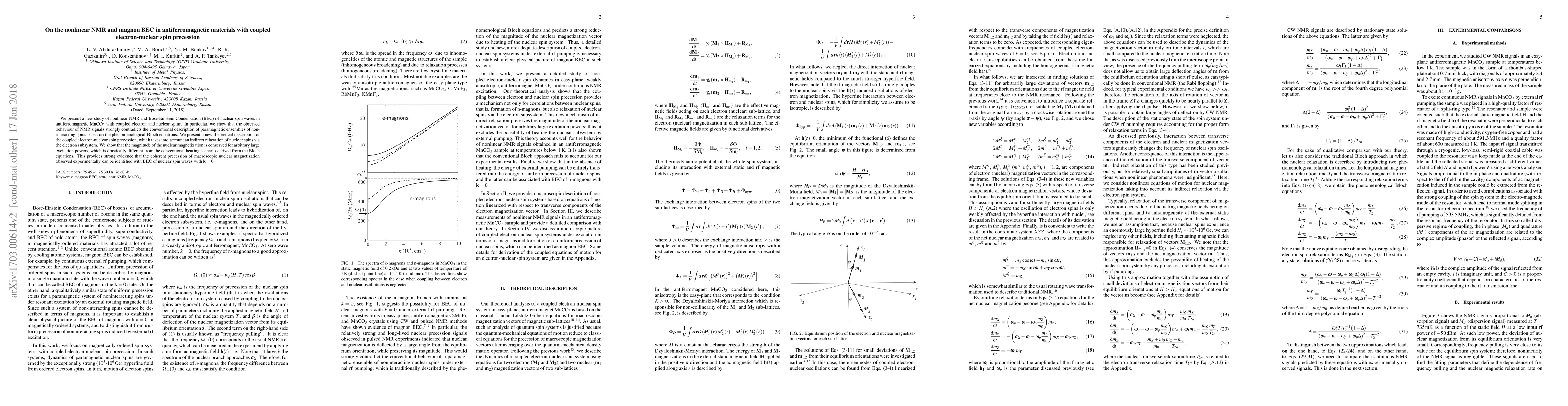 We present a new study of nonlinear NMR and Bose-Einstein Condensation (BEC) of nuclear spin waves in antiferromagnetic MnCO3 with coupled electron and nuclear spins. In particular, we show that the observed behaviour of NMR signals strongly contradicts the conventional description of paramagnetic ensembles of noninteracting spins based on the phenomenological Bloch equations. We present a new theoretical description of the coupled electron-nuclear spin precession, which takes into account an indirect relaxation of nuclear spins via the electron subsystem. We show that the magnitude of the nuclear magnetization is conserved for arbitrary large excitation powers, which is drastically different from the conventional heating scenario derived from the Bloch equations. This provides strong evidence that the coherent precession of macroscopic nuclear magnetization observed experimentally can be identified with BEC of nuclear spin waves with k=0.