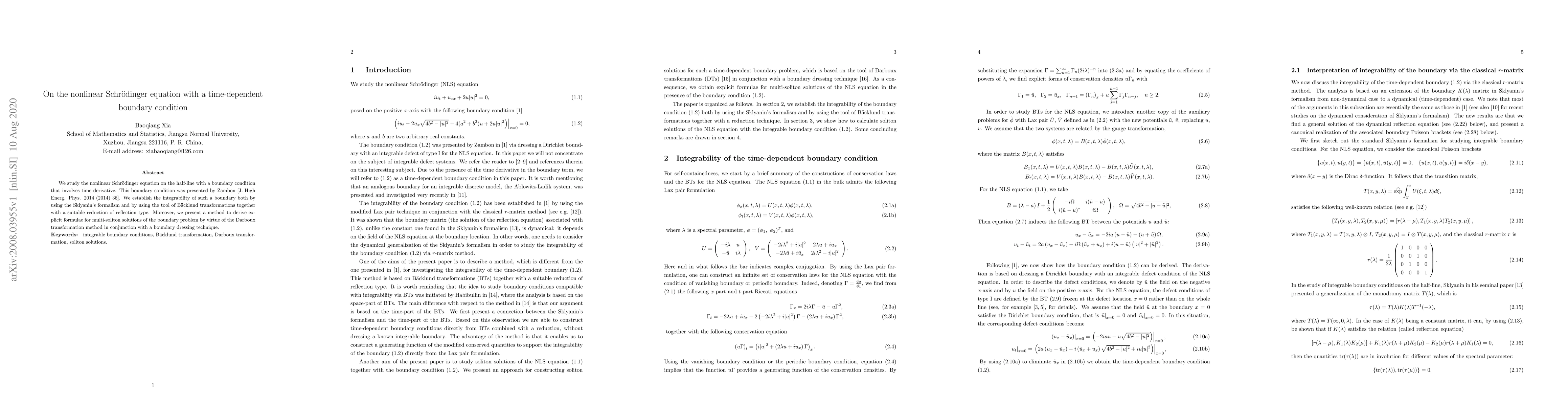 This paper investigates the nonlinear Schrödinger equation on the half-line with a time-dependent boundary condition, establishing its integrability via Sklyanin's formalism and Bäcklund transformations. It also provides explicit formulae for multi-soliton solutions using the Darboux transformation and boundary dressing technique.