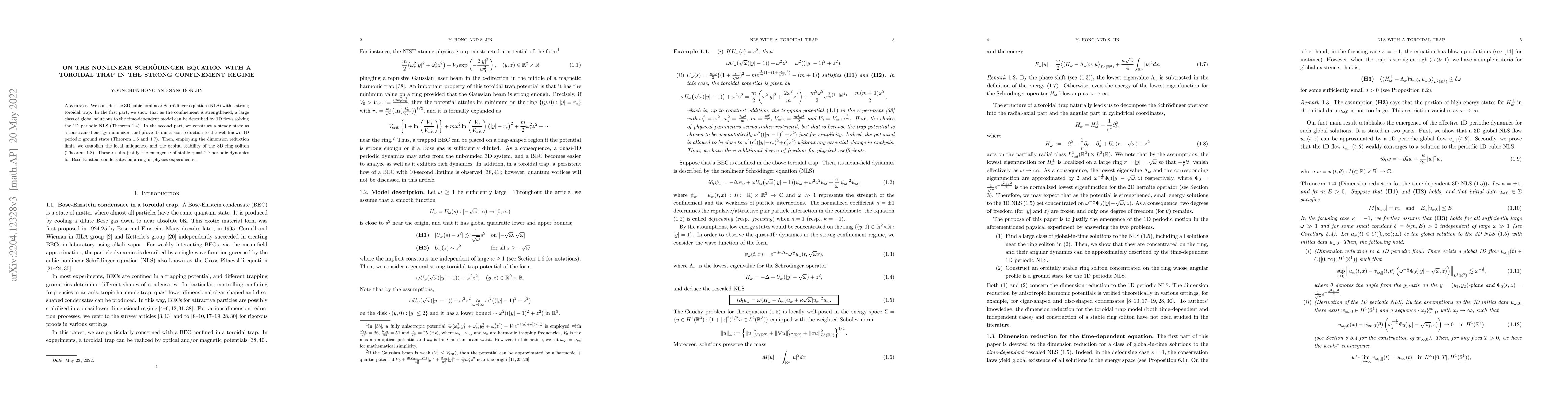 This paper investigates the 3D nonlinear Schrödinger equation in a toroidal trap under strong confinement, demonstrating that global solutions can be approximated by 1D flows. It constructs a steady state and proves its reduction to a 1D periodic ground state, establishing local uniqueness and orbital stability of the 3D ring soliton, supporting quasi-1D dynamics in Bose-Einstein condensates.