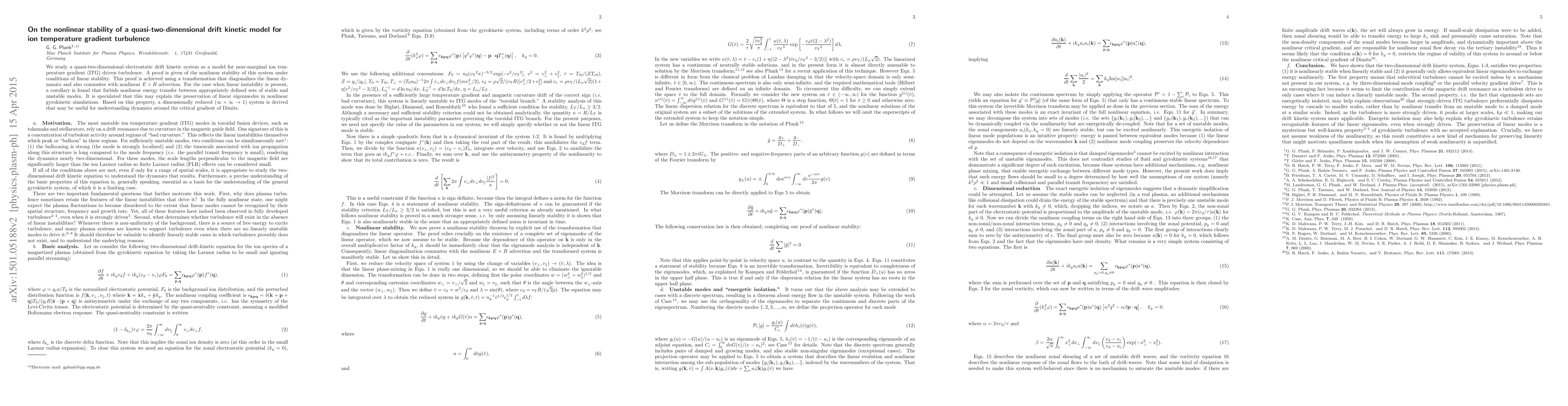We study a quasi-two-dimensional electrostatic drift kinetic system as a model for near-marginal ion temperature gradient (ITG) driven turbulence. A proof is given of the nonlinear stability of this system under conditions of linear stability. This proof is achieved using a transformation that diagonalizes the linear dynamics and also commutes with nonlinear $E\times B$ advection. For the case when linear instability is present, a corollary is found that forbids nonlinear energy transfer between appropriately defined sets of stable and unstable modes. It is speculated that this may explain the preservation of linear eigenmodes in nonlinear gyrokinetic simulations. Based on this property, a dimensionally reduced ($\infty\times\infty \rightarrow 1$) system is derived that may be useful for understanding dynamics around the critical gradient of Dimits.