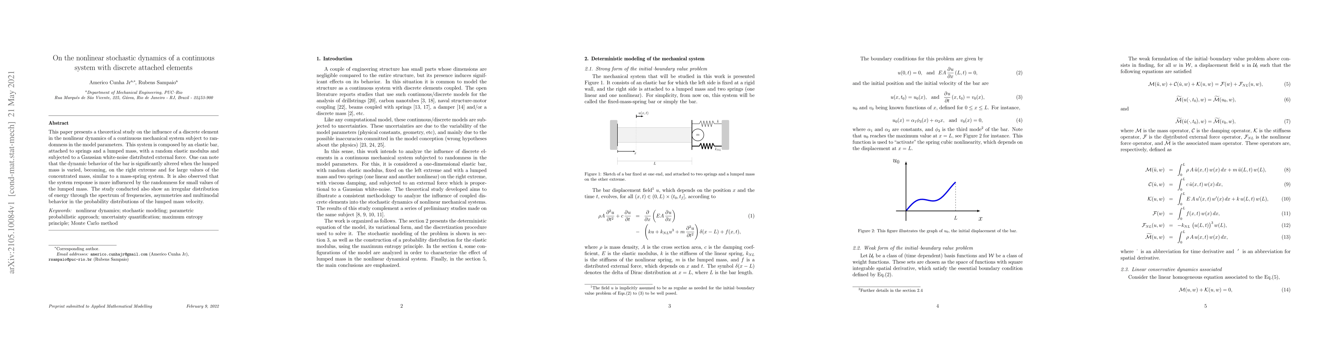 This paper presents a theoretical study on the influence of a discrete element in the nonlinear dynamics of a continuous mechanical system subject to randomness in the model parameters. This system is composed by an elastic bar, attached to springs and a lumped mass, with a random elastic modulus and subjected to a Gaussian white-noise distributed external force. One can note that the dynamic behavior of the bar is significantly altered when the lumped mass is varied, becoming, on the right extreme and for large values of the concentrated mass, similar to a mass-spring system. It is also observed that the system response is more influenced by the randomness for small values of the lumped mass. The study conducted also show an irregular distribution of energy through the spectrum of frequencies, asymmetries and multimodal behavior in the probability distributions of the lumped mass velocity.