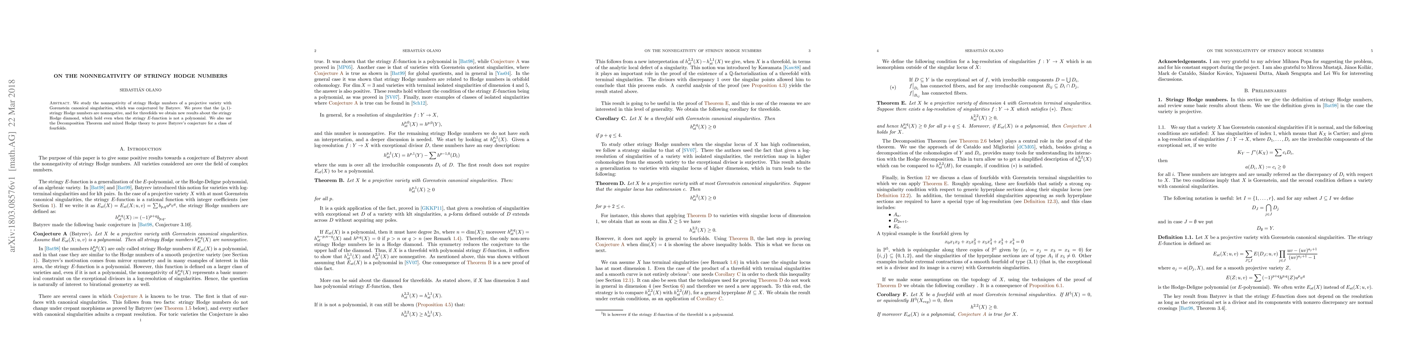 We study the nonnegativity of stringy Hodge numbers of a projective variety with Gorenstein canonical singularities, which was conjectured by Batyrev. We prove that the $(p,1)$-stringy Hodge numbers are nonnegative, and for threefolds we obtain new results about the stringy Hodge diamond, which hold even when the stringy $E$-function is not a polynomial. We also use the Decomposition Theorem and mixed Hodge theory to prove Batyrev's conjecture for a class of fourfolds.