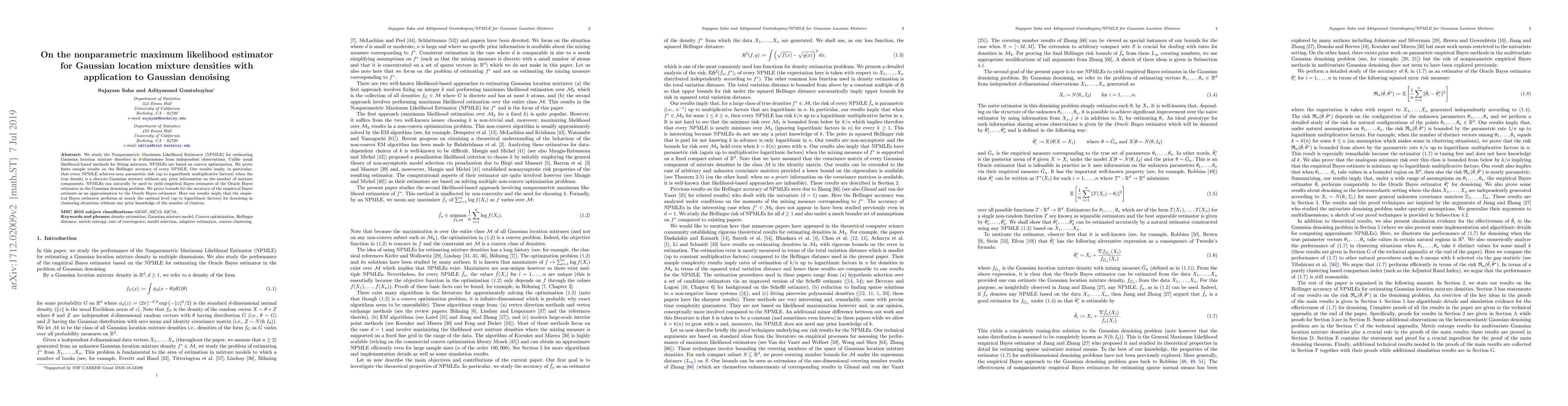 This paper investigates the Nonparametric Maximum Likelihood Estimator (NPMLE) for estimating Gaussian location mixture densities, proving its Hellinger accuracy and near parametric risk. It also demonstrates NPMLE's effectiveness in Gaussian denoising, showing that the empirical Bayes estimator approximates the Oracle Bayes estimator nearly optimally.