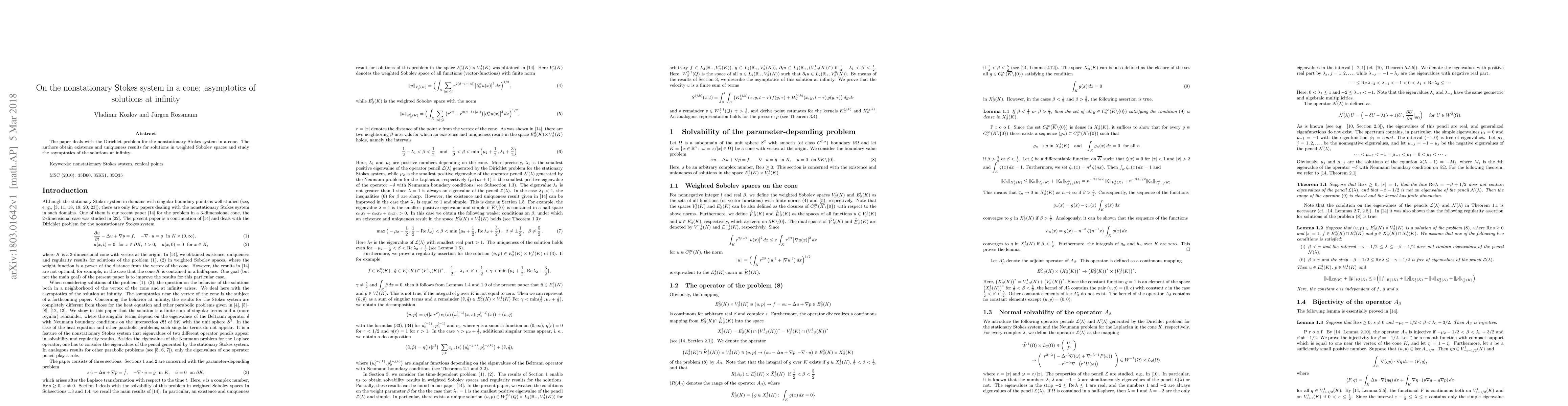 Summary: This paper investigates the Dirichlet problem for the nonstationary Stokes system within a cone, proving existence and uniqueness of solutions in weighted Sobolev spaces, and analyzes the asymptotic behavior of these solutions as they approach infinity.