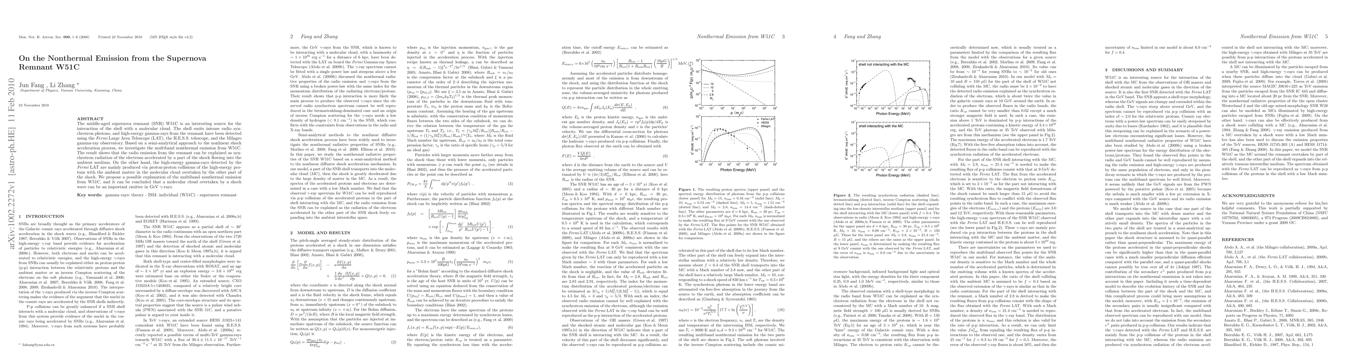 This paper investigates the nonthermal emission from the supernova remnant W51C, revealing that radio synchrotron emissions are due to electrons accelerated by a shock in the ambient medium, while high-energy gamma-rays detected by Fermi LAT are primarily from proton-proton collisions in a molecular cloud overtaken by another shock part.