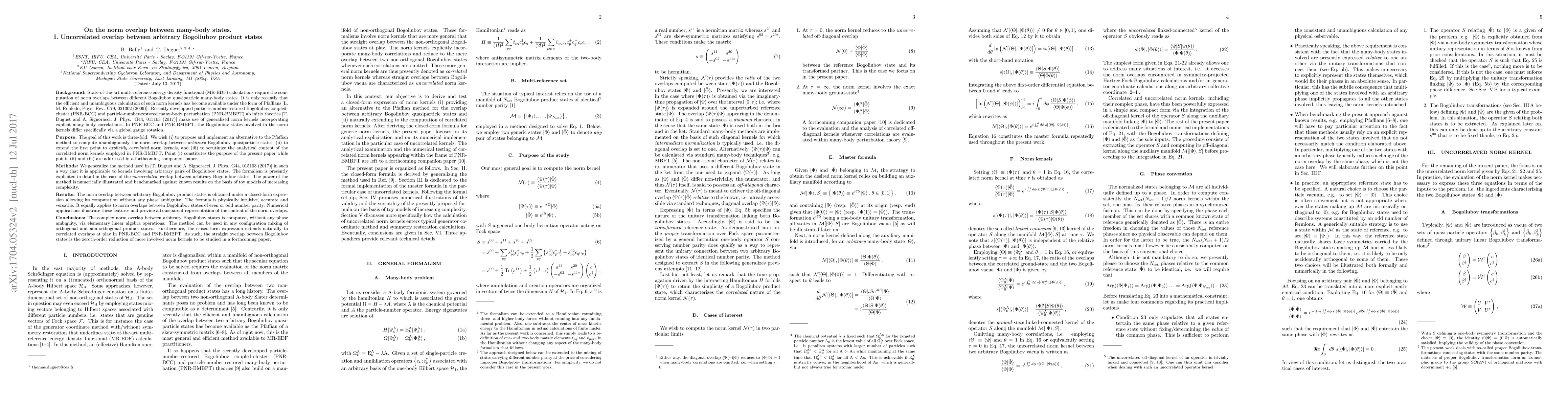 State-of-the-art multi-reference energy density functional calculations require the computation of norm overlaps between different Bogoliubov quasiparticle many-body states. It is only recently that the efficient and unambiguous calculation of such norm kernels has become available under the form of Pfaffians~[L. M. Robledo, Phys. Rev. C79, 021302 (2009)]. The goals of this work is (i) to propose and implement an alternative to the Pfaffian method to compute unambiguously the norm overlap between arbitrary Bogoliubov quasiparticle states and (ii) to extend the first point to explicitly correlated norm kernels at play in recently developped particle-number-restored Bogoliubov coupled-cluster (PNR-BCC) and particle-number-restored many-body perturbation (PNR-BMBPT) ab initio theories~[T. Duguet and A. Signoracci, J. Phys. G44, 015103 (2017)]. Point (i) constitutes the purpose of the present paper while point (ii) is addressed in a forthcoming companion paper. We generalize the method used in~[T. Duguet and A. Signoracci, J. Phys. G44, 015103 (2017)] to obtain the norm overlap between arbitrary Bogoliubov product states under a closed-form expression. The formula is physically intuitive, accurate, versatile and relies on elementary linear algebra operations. It equally applies to norm overlaps between Bogoliubov states of even or odd number parity. Numerical applications illustrate these features and provide a transparent representation of the content of the norm overlaps. Furthermore, the closed-form expression extends naturally to correlated overlaps at play in PNR-BCC and PNR-BMBPT. As such, the straight overlap between Bogoliubov states is the zeroth-order reduction of more involved norm kernels to be studied in the forthcoming paper.