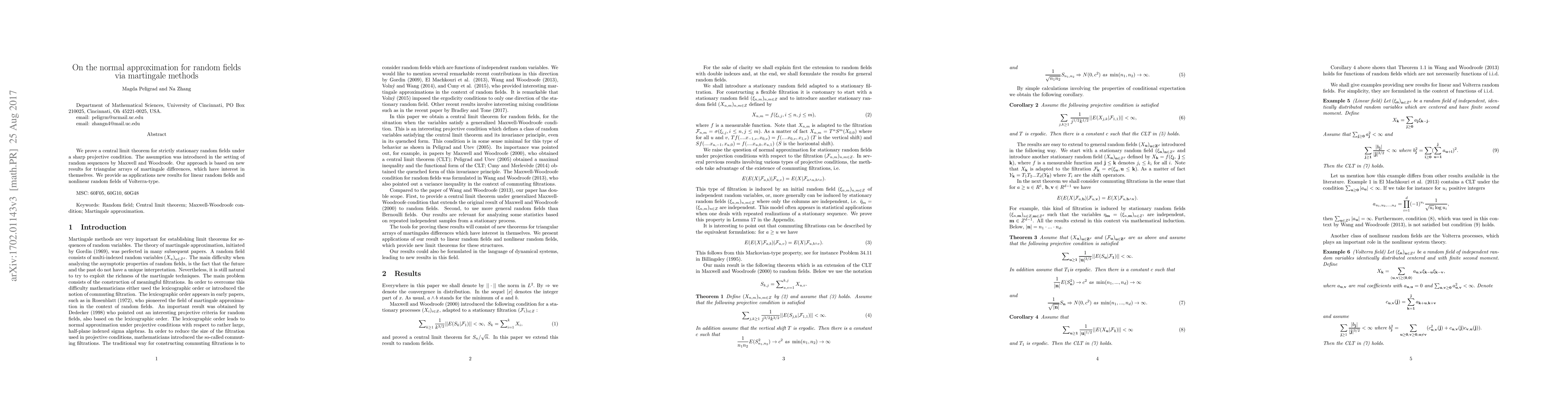 This paper proves a central limit theorem for strictly stationary random fields under a sharp projective condition, utilizing new martingale difference results for triangular arrays. Applications include new findings for linear and nonlinear Volterra-type random fields.