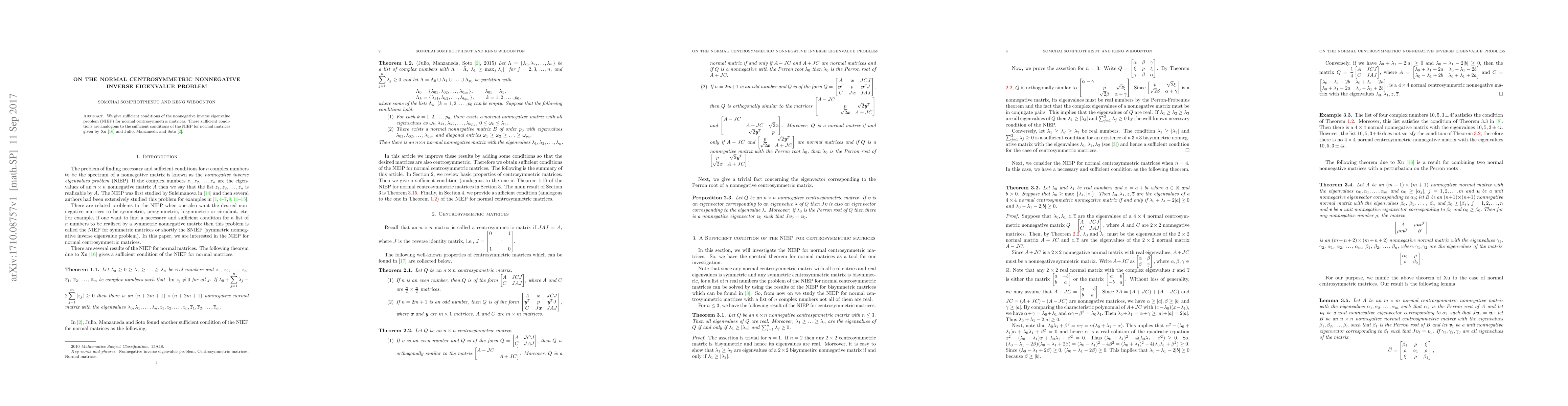 Summary: This paper provides sufficient conditions for the nonnegative inverse eigenvalue problem (NIEP) for normal centrosymmetric matrices, drawing parallels to existing conditions for normal matrices, as established by Xu and Julio, Manzaneda, and Soto.