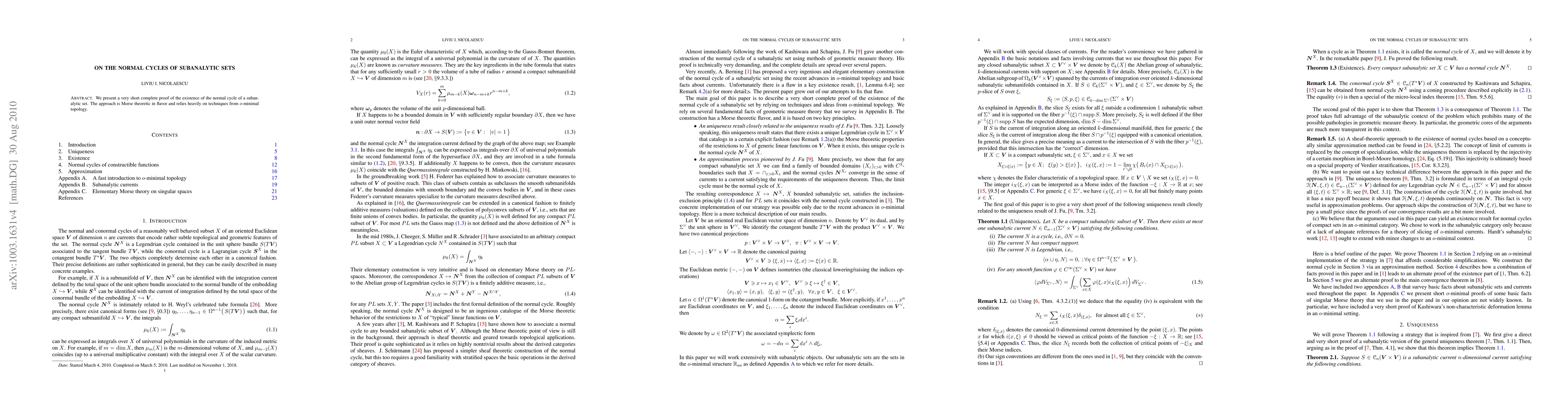 We present a short complete proof of the existence of the normal cycle of a compact subanalytic set. The approach is inspired by some old ides of Joseph Fu, uses Morse theoretic techniques and $o$-minimal topology.