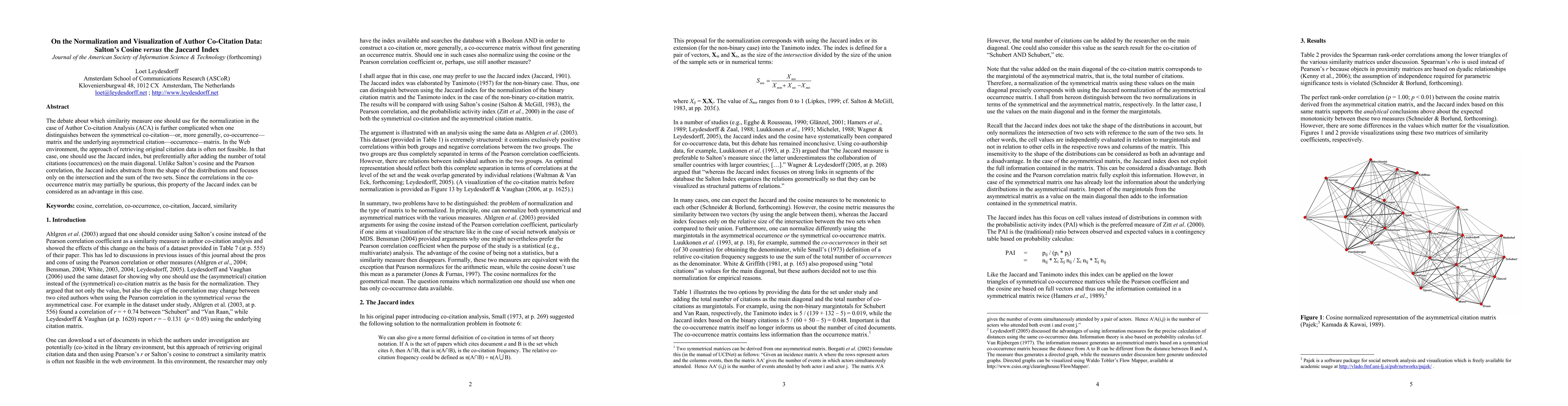 This paper discusses the use of similarity measures for normalization in Author Co-citation Analysis, advocating for the Jaccard index over Salton's cosine when original citation data is unavailable. It highlights the Jaccard index's advantage in focusing on set intersections, reducing the impact of spurious correlations.