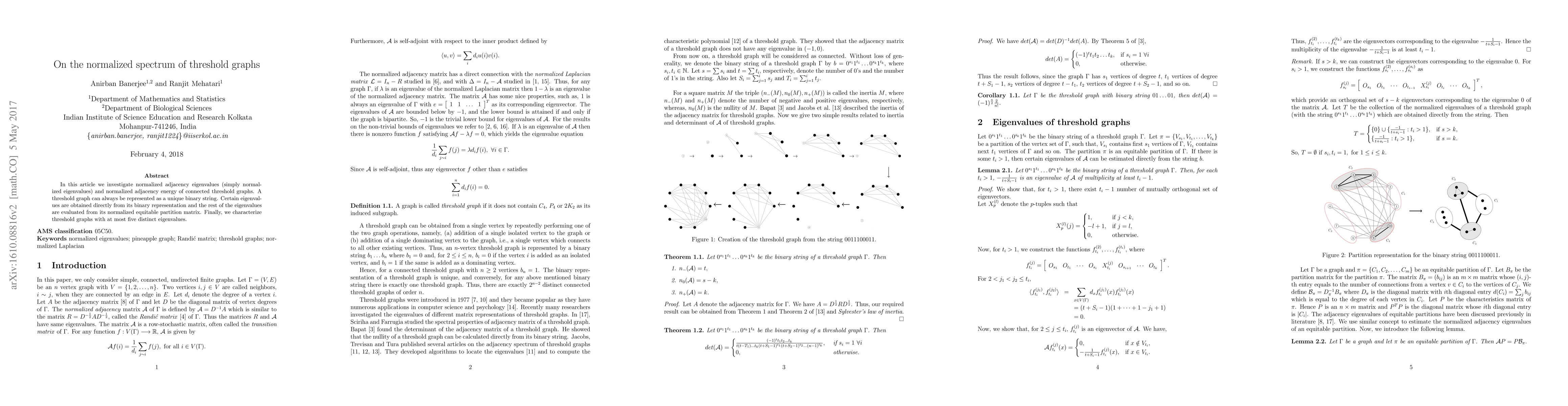 This paper investigates threshold graphs with distinct eigenvalues, finding that those with at most five distinct eigenvalues exist, and provides a method to calculate their normalized spectrum.