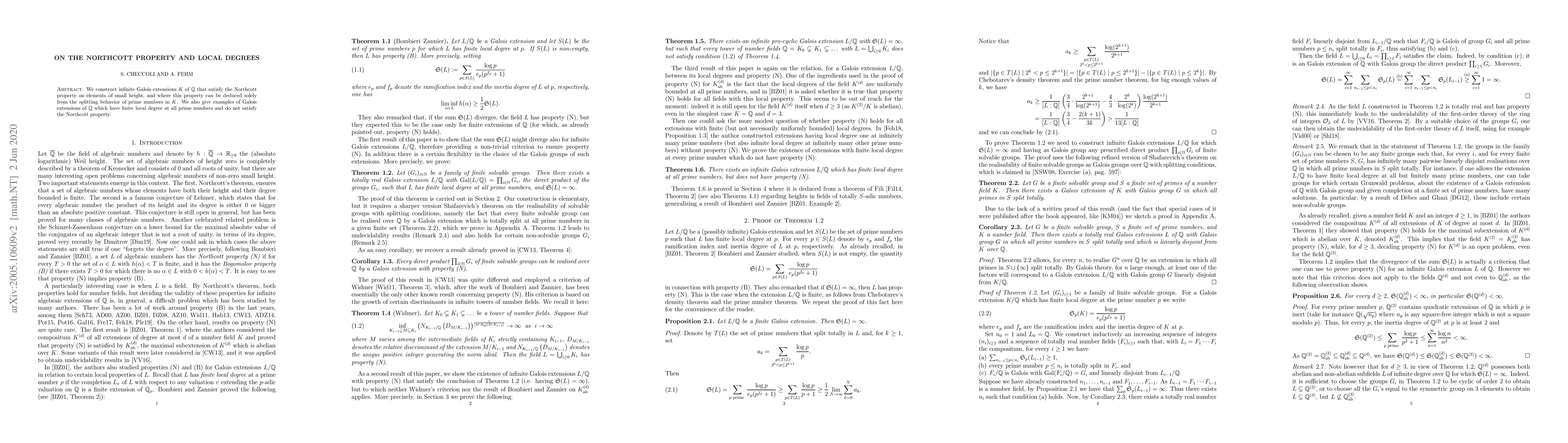 This paper constructs infinite Galois extensions of $\mathbb{Q}$ with the Northcott property for elements of small height, linked to prime splitting behavior, and provides examples of extensions with finite local degrees that lack this property.