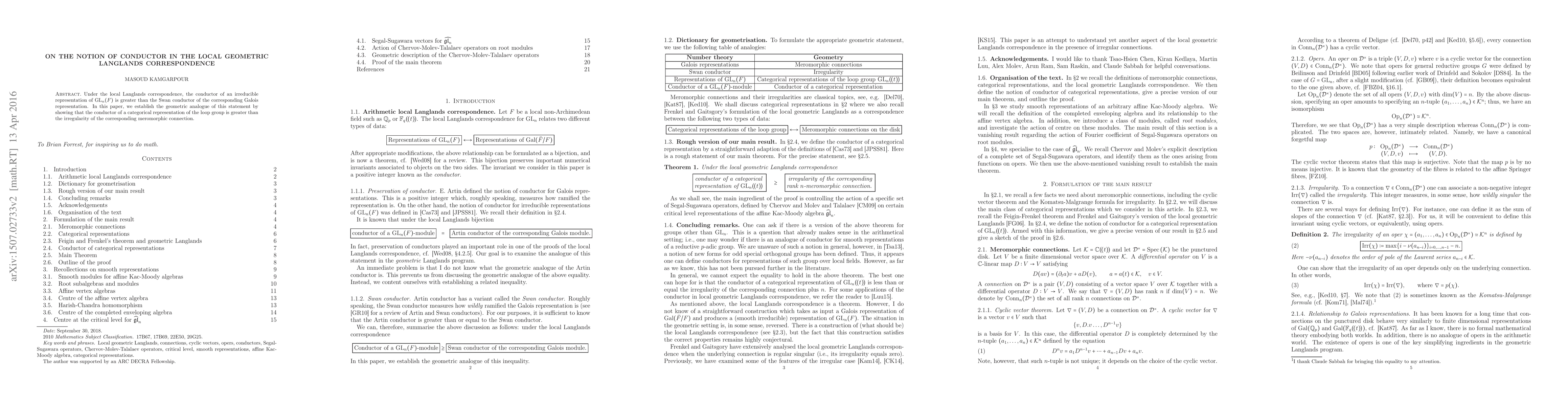 This paper establishes the geometric analogue of the local Langlands correspondence, demonstrating that the conductor of a categorical representation of the loop group exceeds the irregularity of the corresponding meromorphic connection. This extends the notion of conductor beyond the classical setting.