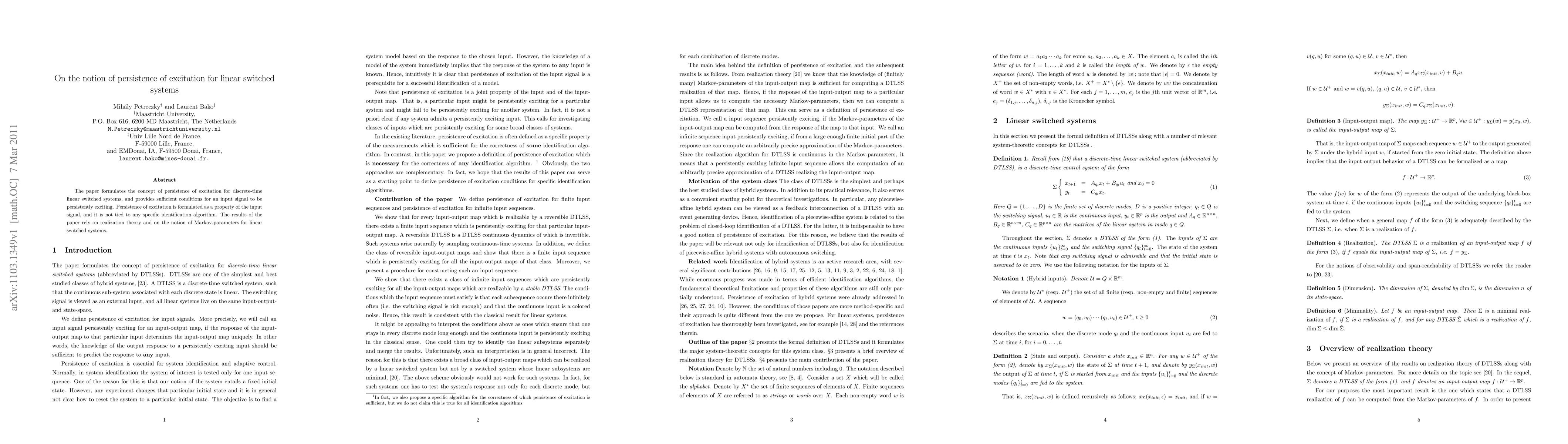 The paper introduces the concept of persistence of excitation for discrete-time linear switched systems and provides conditions for an input signal to be persistently exciting, independent of any identification algorithm. The results are based on realization theory and the Markov-parameters for linear switched systems.